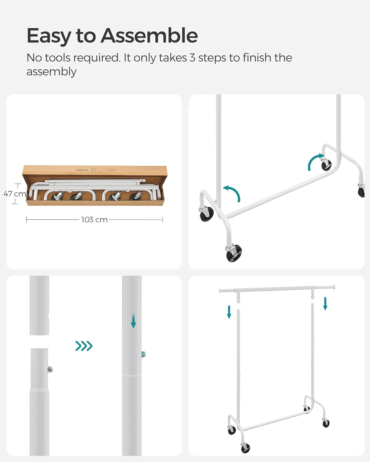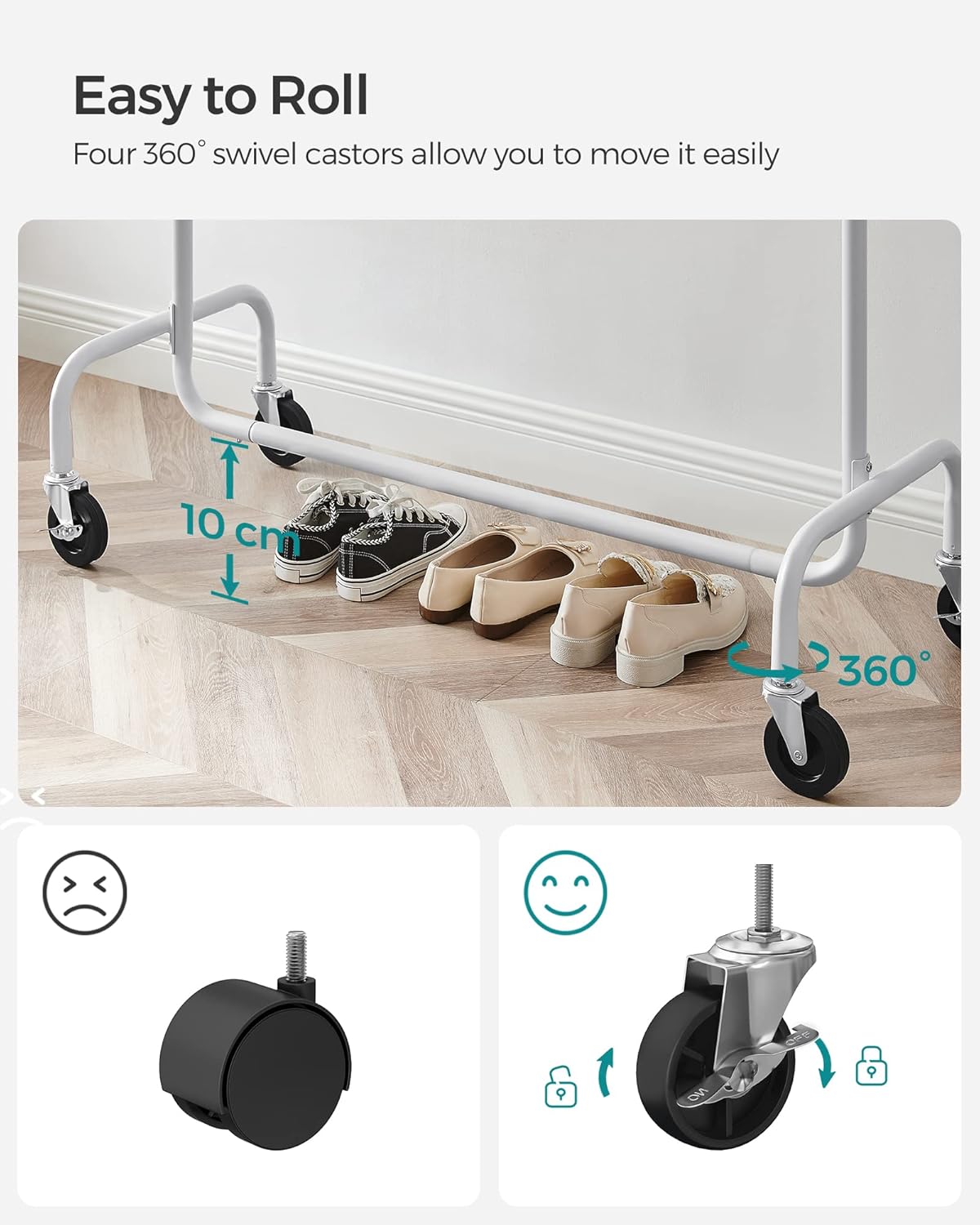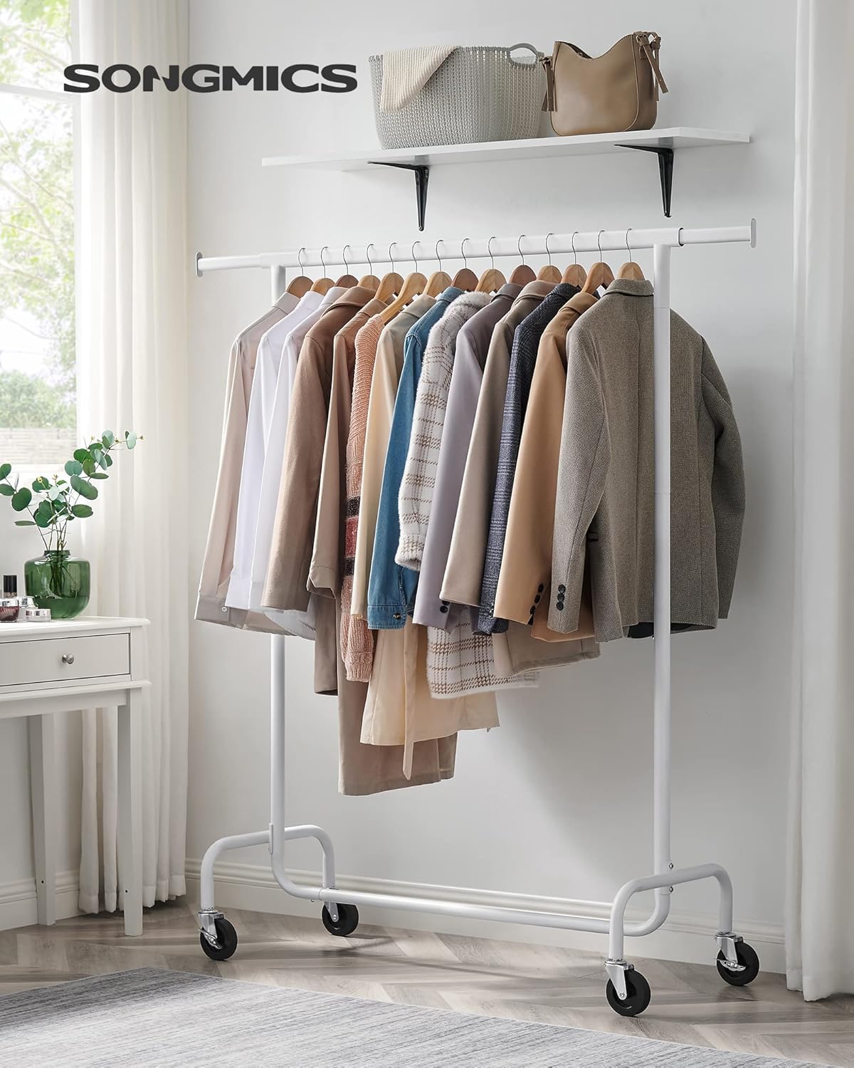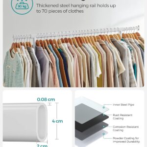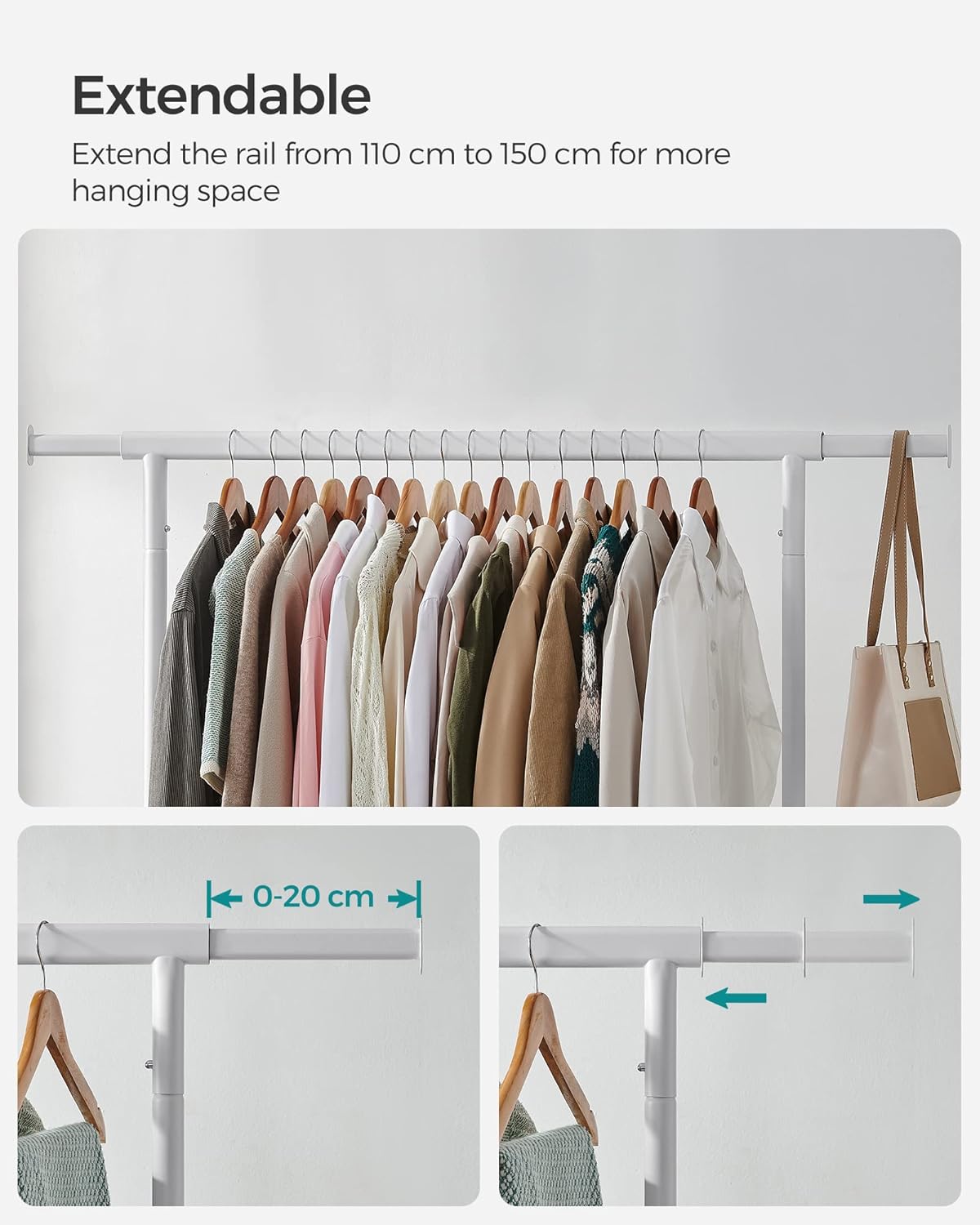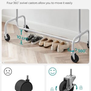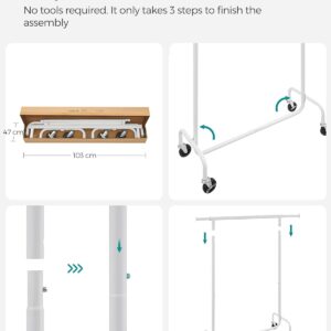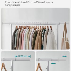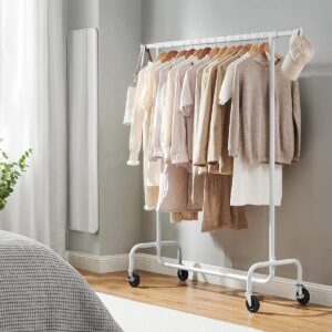 Suportul de haine SONGMICS extensibil cu roti este ideal pentru organizarea flexibila a hainelor. Bara reglabila ofera mai mult spatiu de agatare, iar structura robusta din otel permite sustinerea unei greutati mari. Datorita rotilor pivotante, suportul poate fi mutat cu usurinta oriunde ai nevoie.