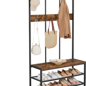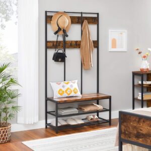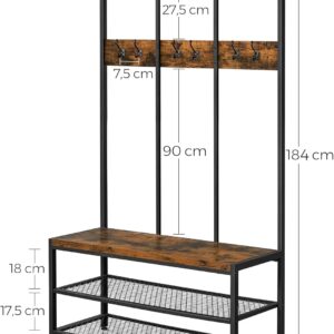 VASAGLE Cuier hol cu 12 carlige si banca pantofi, cadru metalic, stil industrial, 100x40x186 cm, maro rustic