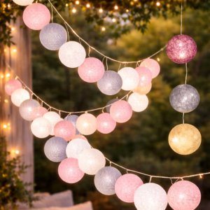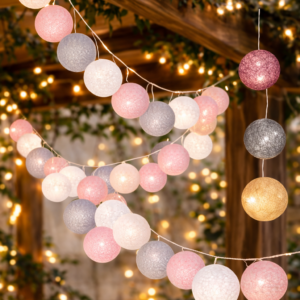 Instalatia decorativa cu 20 de LED-uri si bile colorate in nuante pastelate de roz, alb si gri creeaza o atmosfera calda si relaxanta. Ideala pentru decorarea dormitorului, livingului sau meselor festive, aceasta instalatie ofera o lumina placuta, difuza, perfecta pentru serile de iarna sau evenimente speciale. Functioneaza pe baterii, ceea ce permite amplasarea ei oriunde fara nevoie de priza.