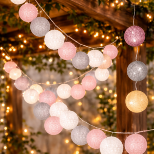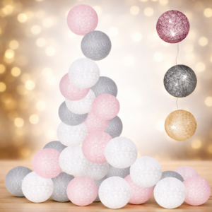 Instalatia decorativa cu 30 de LED-uri si bile textile in tonuri de roz, alb si gri este ideala pentru crearea unei atmosfere calde si relaxante. Cu o lumina alba calda si un design modern, aceasta se potriveste perfect pentru decorarea dormitorului, livingului sau a meselor festive. Functioneaza cu baterii, oferind libertate deplina in amplasare, fara cabluri vizibile.