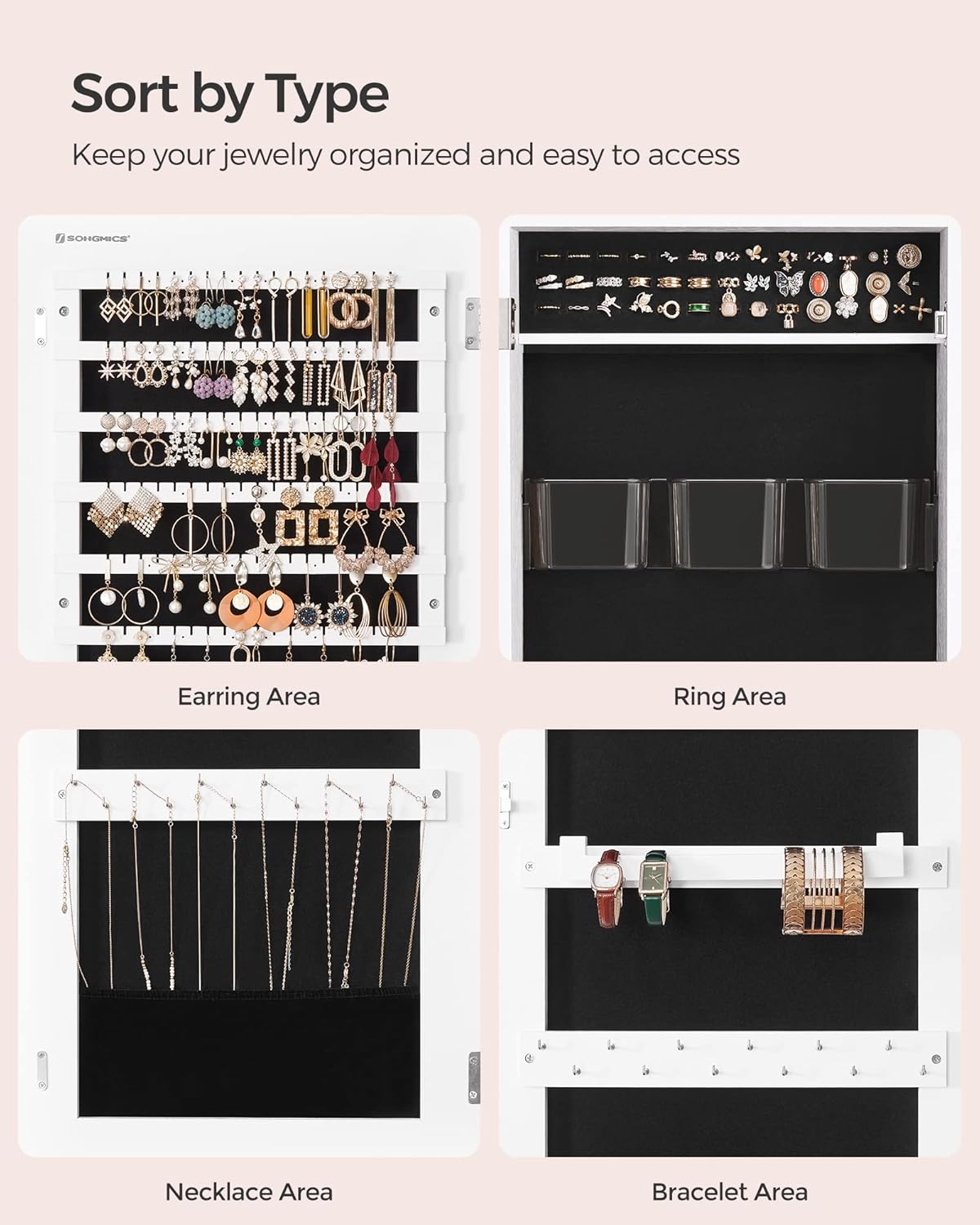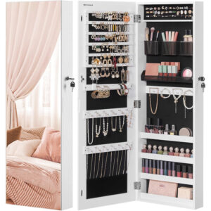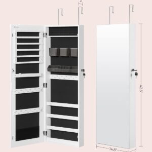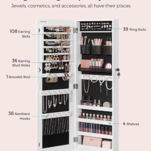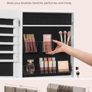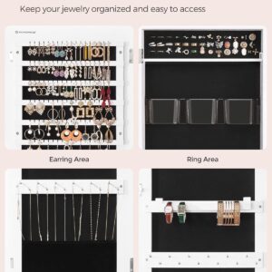 SONGMICS Dulap pentru bijuterii, cu oglinda design fara rama, MDF, montare pe perete sau usa, 37x10x108 cm, alb