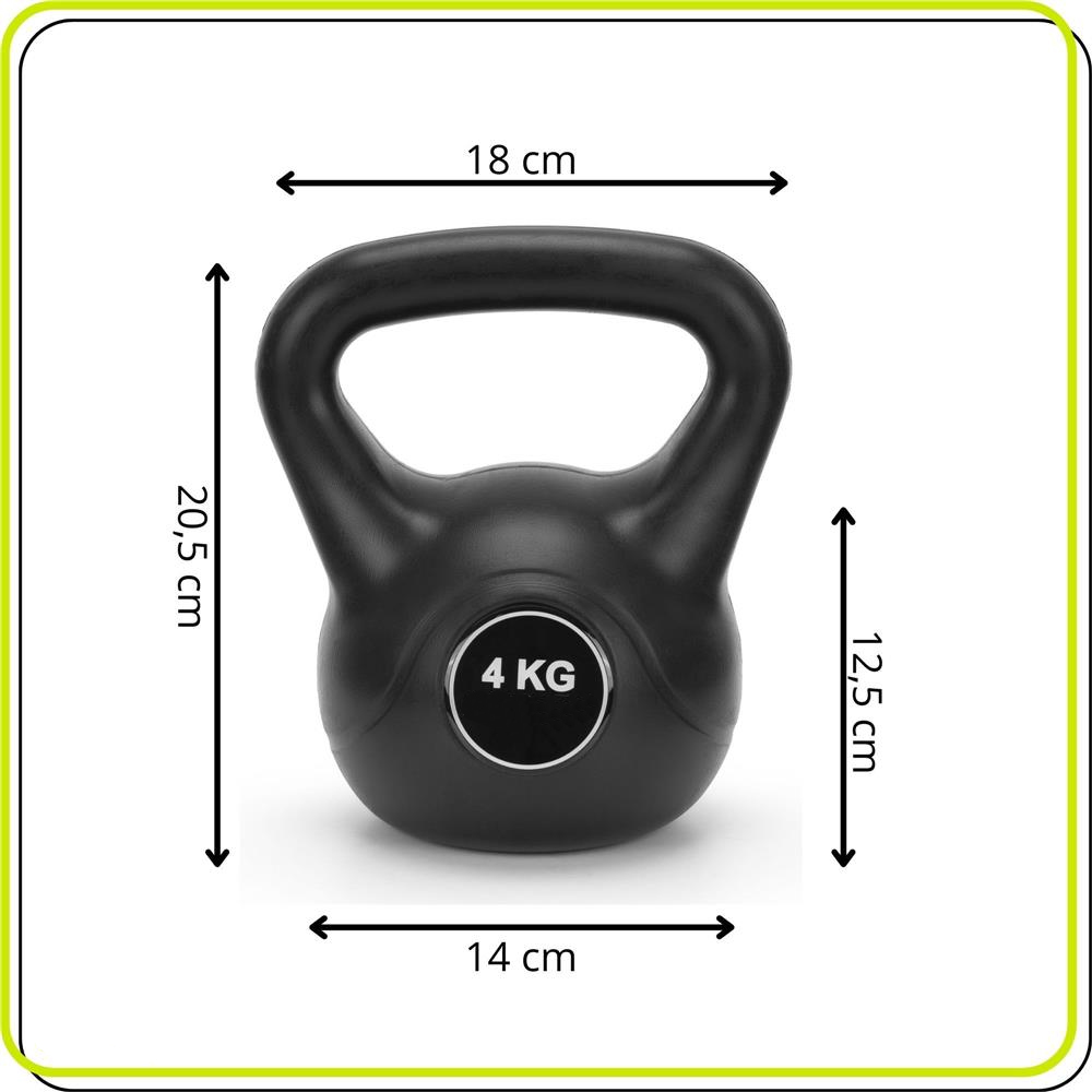 Kettlebell de 4 kg potrivit pentru antrenamente de forta, tonifiere si exercitii functionale. Realizat din ABS rezistent cu umplere din ciment, ofera stabilitate si durabilitate. Manerul ergonomic asigura prindere sigura si control optim in timpul miscarilor dinamice.