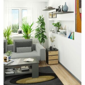 Comoda compacta cu 3 sertare, in combinatia moderna de grafit si stejar artisan, realizata din PAL laminat rezistent la uzura. Designul sau elegant si versatil o face ideala ca noptiera sau spatiu suplimentar de depozitare in dormitor ori birou.