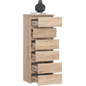 Comoda cu 6 sertare este o solutie practica si eleganta pentru organizarea dormitorului, livingului sau camerei copiilor. Realizata din placa laminata rezistenta la uzura, comoda ofera spatiu generos pentru depozitare, fiind usor de integrat in orice incapere datorita nuantei moderne de stejar sonoma.