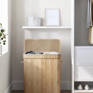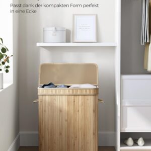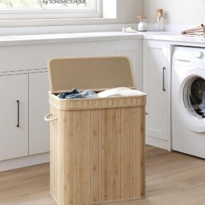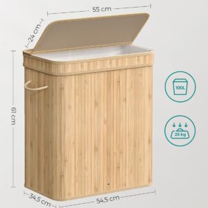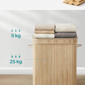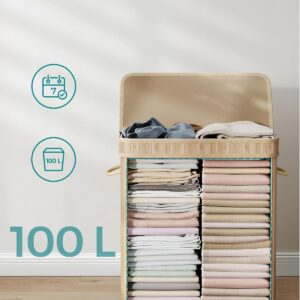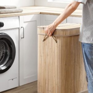 Cosul de rufe SONGMICS cu capac este o solutie practica si eleganta pentru depozitarea hainelor. Cu o capacitate generoasa de 100L, este ideal pentru utilizarea zilnica in familie. Structura din bambus si cadrul metalic ofera stabilitate, iar sacul interior detasabil faciliteaza transportul si spalarea rufelor.