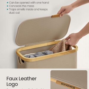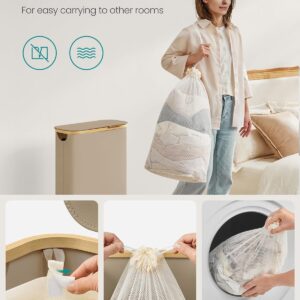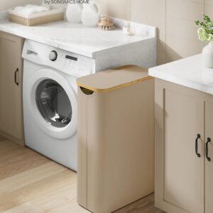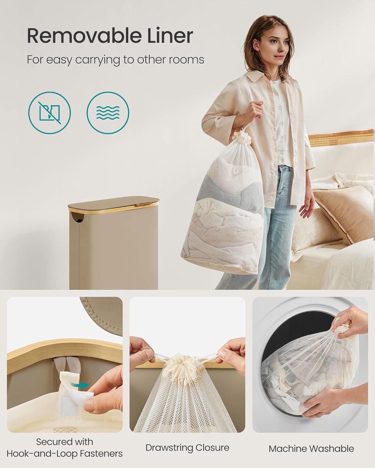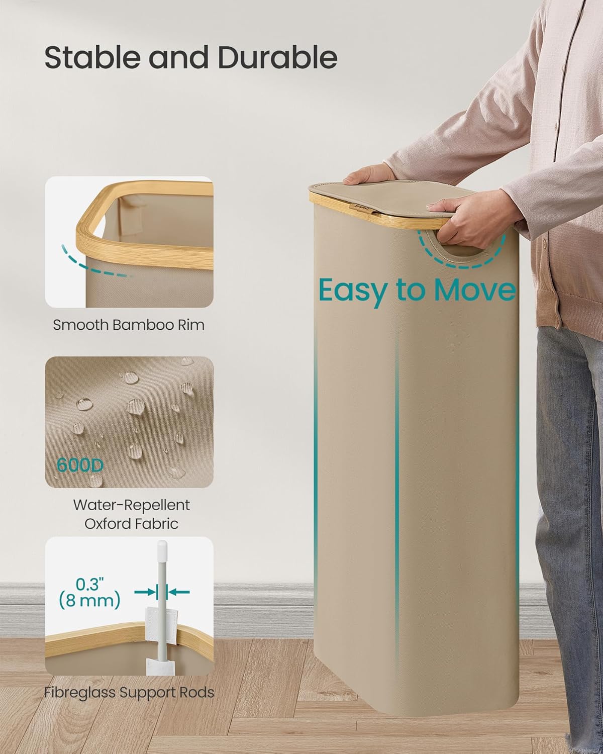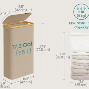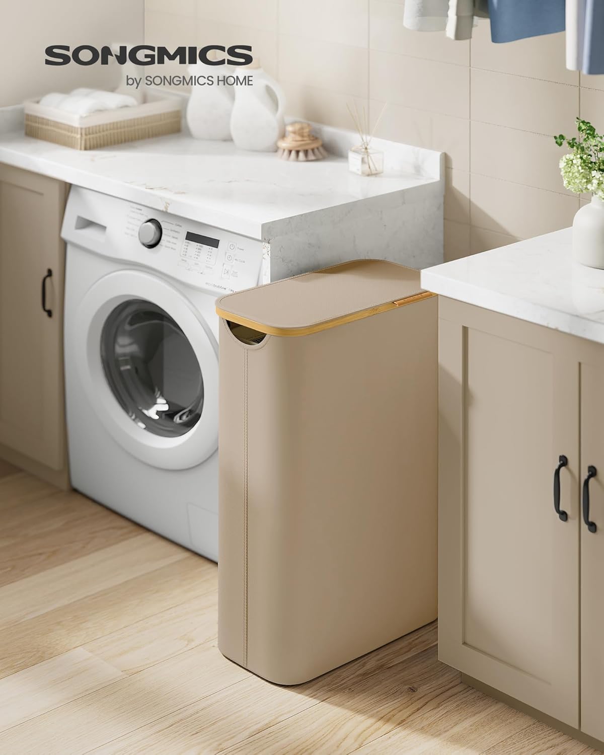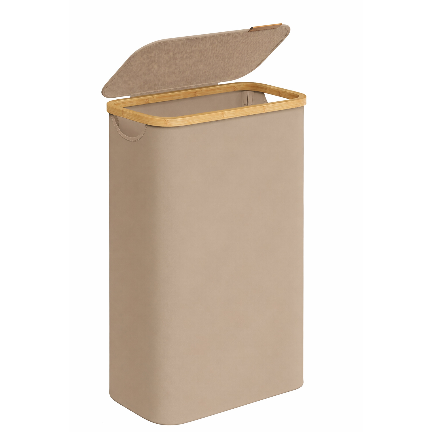 Cos de rufe slim, cu o capacitate de 65 L, ideal pentru spatii inguste precum bai mici, garsoniere sau camere compacte. Realizat din material Oxford rezistent la apa si rupere, cu design clasic si nuanta camel brown. Prevazut cu capac pentru discretie si sac interior detasabil ce poate fi folosit si ca sac pentru spalare la masina.