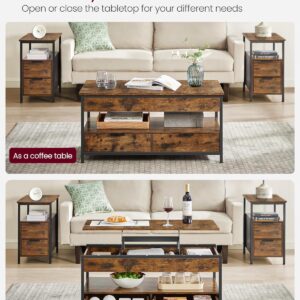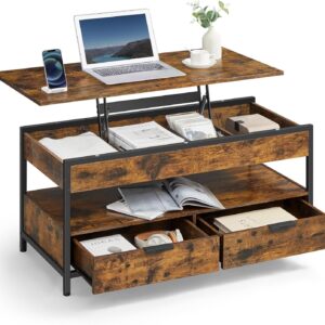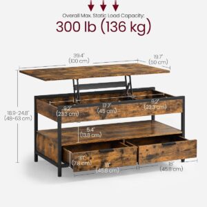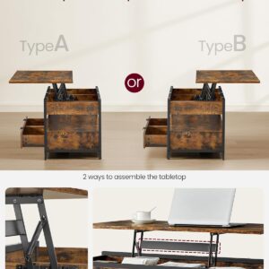 Masuta de cafea VASAGLE cu blat reglabil pe inaltime este solutia ideala pentru livingurile moderne. Blatul rabatabil permite utilizarea confortabila pentru lucru, masa sau relaxare, iar compartimentele ascunse si sertarele ajuta la organizarea eficienta a spatiului. Structura metalica si finisajul maro vintage completeaza designul industrial.