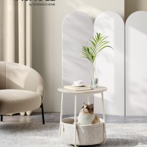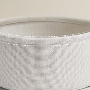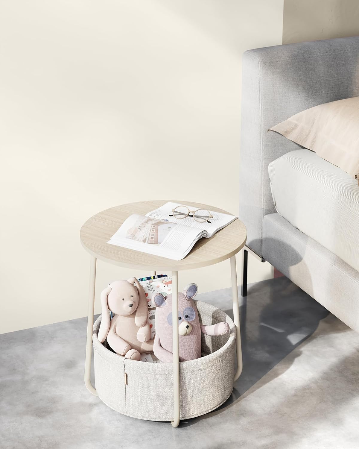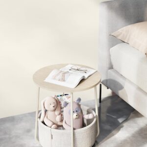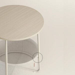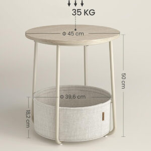 Masuta rotunda moderna, ideala ca masuta de cafea, masuta laterala sau noptiera. Are cadru metalic stabil, blat din PAL si cos textil spatios pentru depozitare. Design compact, potrivit pentru spatii mici, cu un aspect elegant in combinatie bej natural si alb crem.