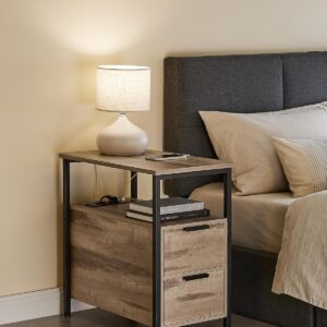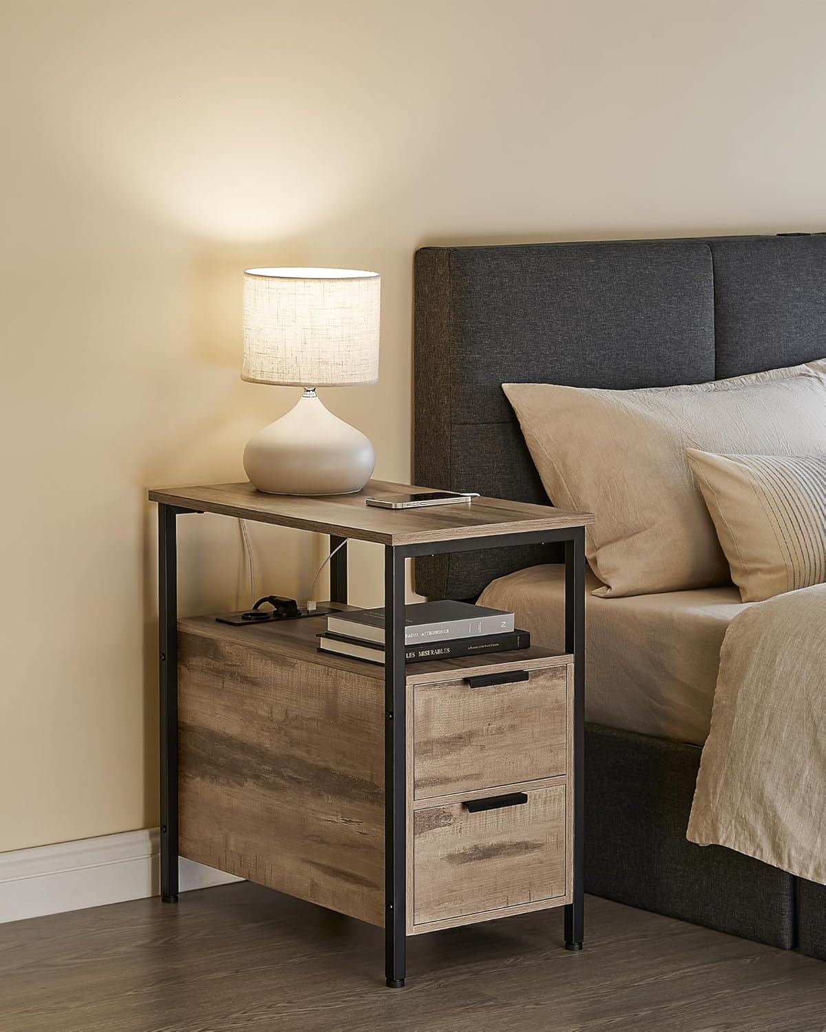 Noptiera VASAGLE este o solutie moderna si practica pentru organizarea spatiului din dormitor sau living. Dotata cu prize si porturi USB, permite incarcarea dispozitivelor direct langa tine. Designul compact include sertare, rafturi si spatiu suplimentar pentru depozitare, fiind ideala pentru spatii mici.
