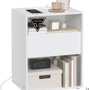 VASAGLE Noptiera cu sertar si statie de incarcare, 2 prize, 2 porturi USB, 45x35x58 cm, alb