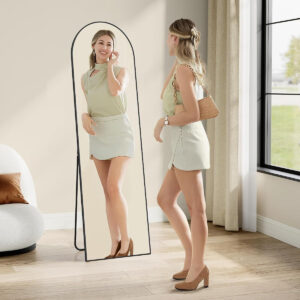 Oglinda moderna de podea cu dimensiuni generoase, ideala pentru verificarea tinutelor din cap pana in picioare. Realizata din sticla securizata pentru siguranta si incadrata intr-o rama eleganta din aluminiu rezistent la rugina, ofera un plus de stil si functionalitate oricarei incaperi.