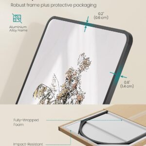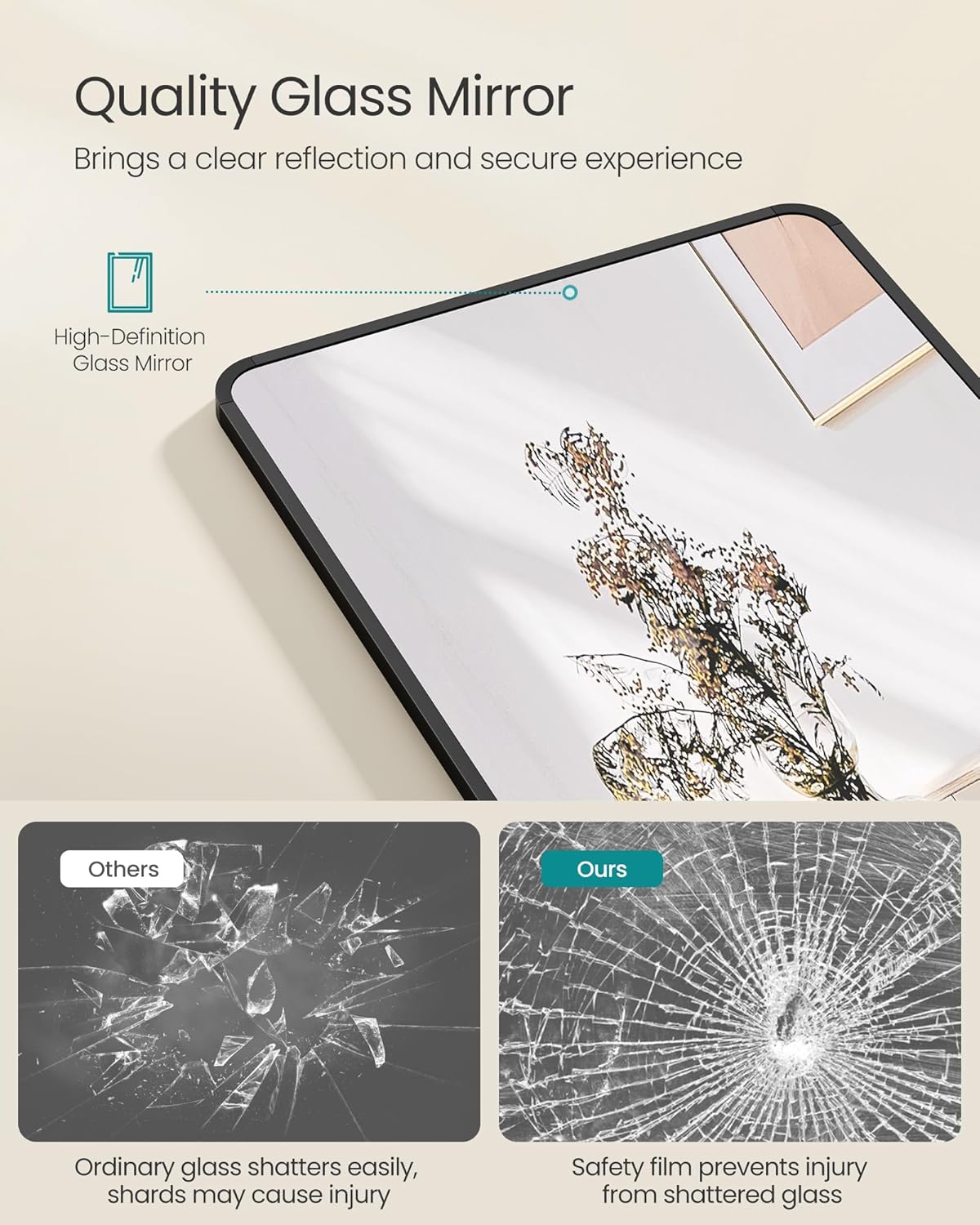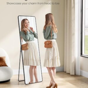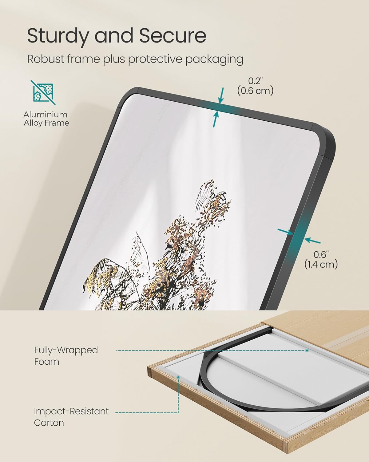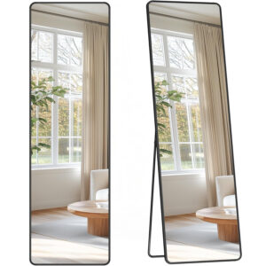 Oglinda de corp SONGMICS ofera o imagine completa din cap pana in picioare, fiind ideala pentru dormitor, living sau hol. Rama subtire din aluminiu si finisajul negru adauga un aspect modern, iar sticla securizata cu folie de protectie asigura utilizare in siguranta. Poate fi folosita atat ca oglinda de podea, cat si montata pe perete.
