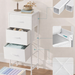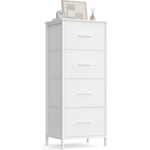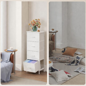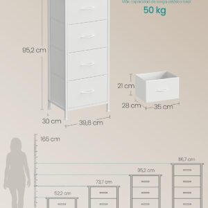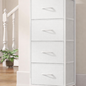 Comoda SONGMICS este o solutie practica si versatila pentru organizarea eficienta a spatiului. Cele 4 sertare textile ofera spatiu generos pentru depozitare, iar blatul superior poate fi folosit pentru obiecte decorative sau uzuale. Designul modern si constructia usoara o fac potrivita pentru dormitor, hol, living sau dressing.