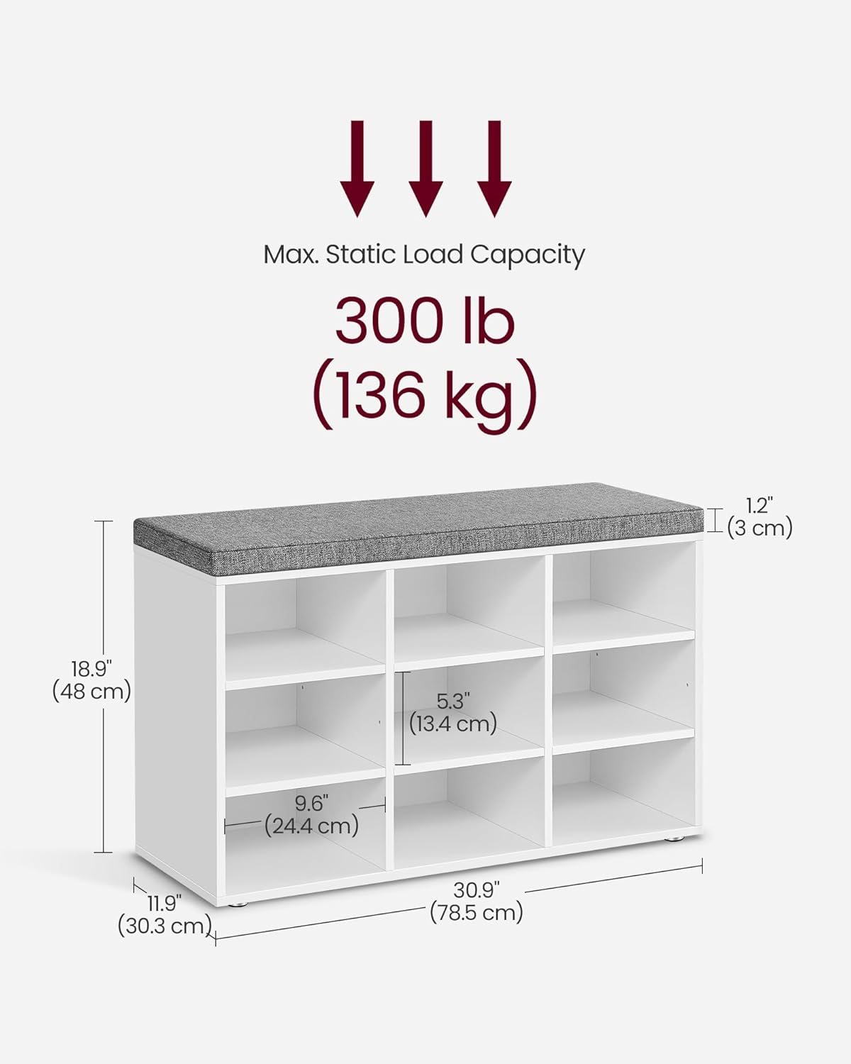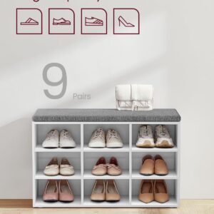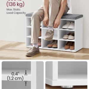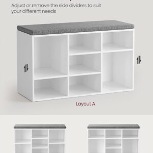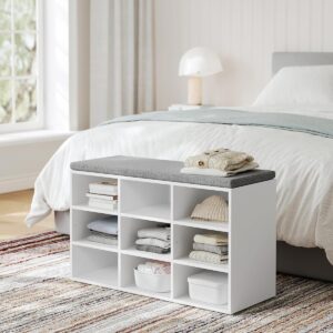 VASAGLE este o banca pentru pantofi cu 9 compartimente, ideala pentru organizarea eficienta a holului. Ofera spatiu pentru pana la 9 perechi de pantofi, iar despartitoarele laterale sunt reglabile sau detasabile pentru incaltaminte mai inalta. Perna moale asigura confort la incaltare, iar designul alb cloud se potriveste usor in orice interior.