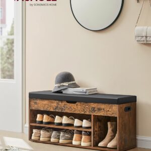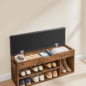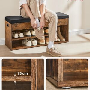 VASAGLE este o banca pentru pantofi cu design rustic, ideala pentru hol, dormitor sau living. Dispune de 3 compartimente deschise pentru incaltaminte si un spatiu de depozitare ascuns sub capac, perfect pentru manusi, esarfe sau accesorii. Sezutul captusit cu spuma si acoperit cu piele PU ofera confort la incaltare, iar structura solida suporta pana la 150 kg.
