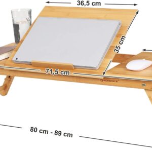 Masa pliabila pentru laptop SONGMICS este fabricata integral din bambus, combinand functionalitatea cu designul natural. Suprafata ventilata previne supraincalzirea laptopului, iar picioarele ajustabile ofera confort ergonomic pentru lucru sau relaxare in pat sau pe canapea.