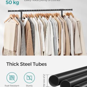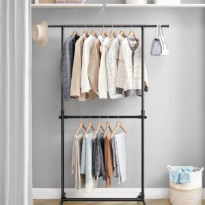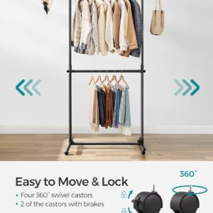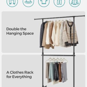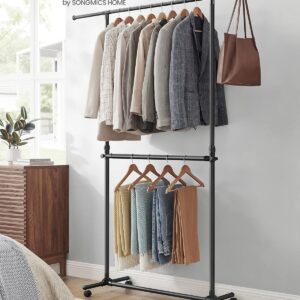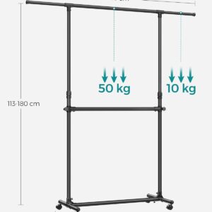 SONGMICS Suport haine cu doua bare, roti blocabile, inaltime reglabila, cadru metalic, 101x49x113-180 cm, negru