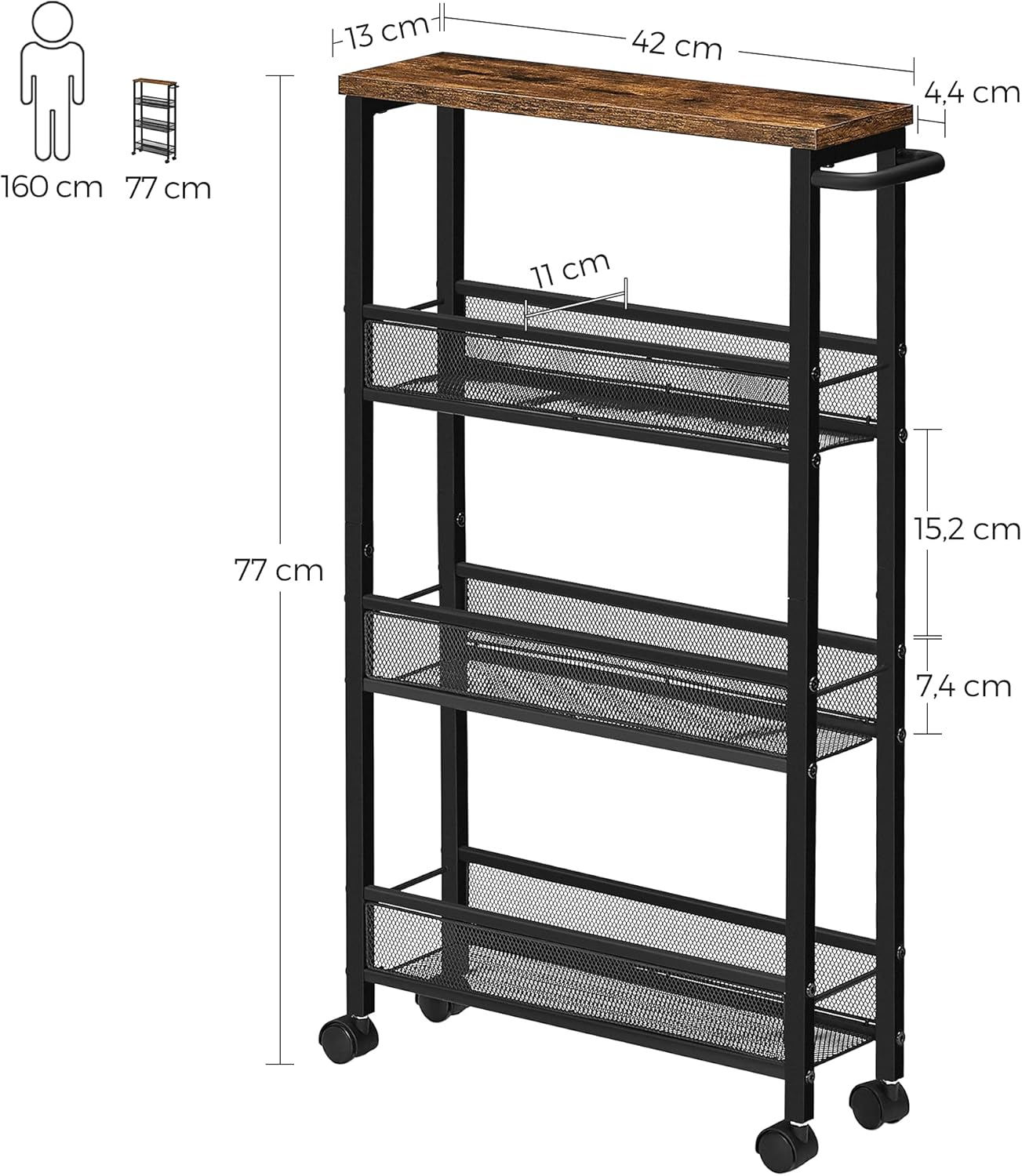 VASAGLE Carucior de bucatarie ingust cu roti, 4 niveluri, cadru metalic, 13x47x77 cm, maro rustic VASAGLE Carucior de bucatarie ingust cu roti, 4 niveluri, cadru metalic, 13x47x77 cm, maro rustic