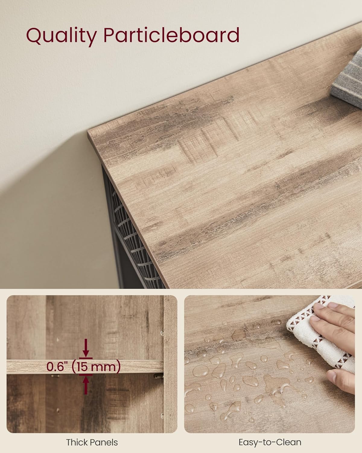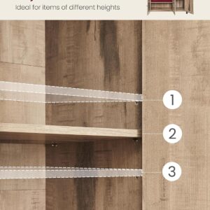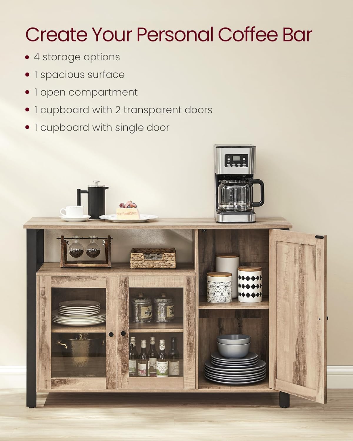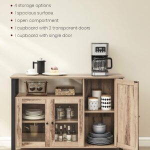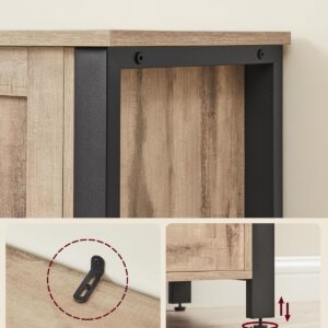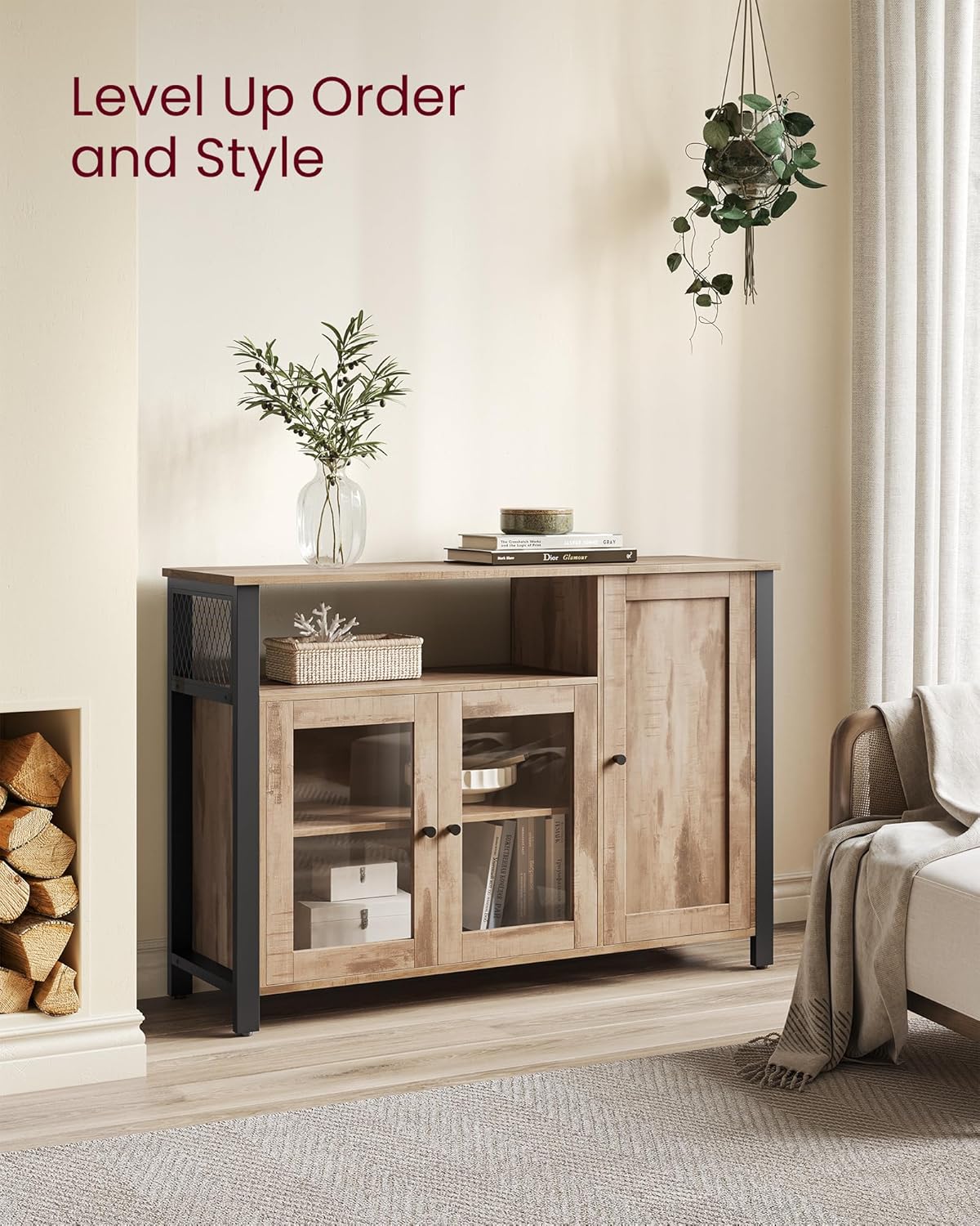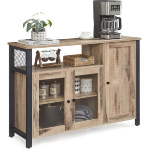 Comoda VASAGLE cu 3 usi este o piesa practica si eleganta, perfecta pentru organizarea eficienta a spatiului. Designul industrial imbina armonios lemnul maro camel cu cadrul metalic negru, iar compartimentarea inteligenta iti permite sa depozitezi usor vesela, pahare sau alte obiecte esentiale.