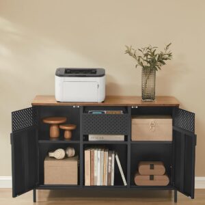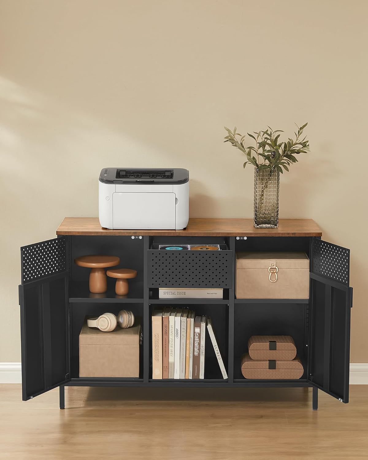 Acest dulap metalic cu 2 usi combina aspectul maro vintage cu accente negre pentru un design modern si practic. Blatul superior este potrivit pentru electrocasnice sau decoratiuni, iar interiorul ofera spatiu generos datorita politei reglabile si compartimentelor variate. Ideal pentru bucatarie, living sau birou.