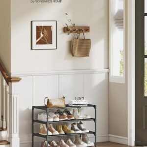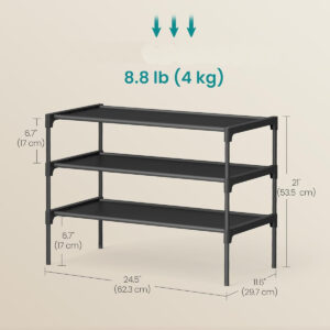 Raftul pentru pantofi SONGMICS cu 3 niveluri este o solutie practica si compacta pentru organizarea incaltamintei in hol, dressing sau dormitor. Structura usoara dar stabila, realizata din cadru metalic si rafturi textile rezistente, ofera spatiu suficient pentru depozitarea mai multor perechi de pantofi, mentinand incaperile ordonate si aerisite.