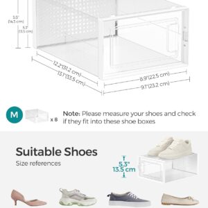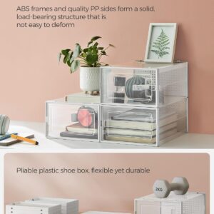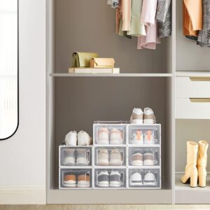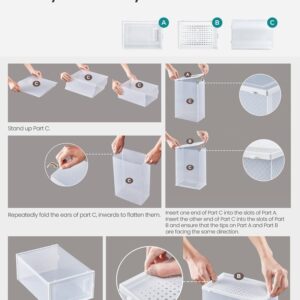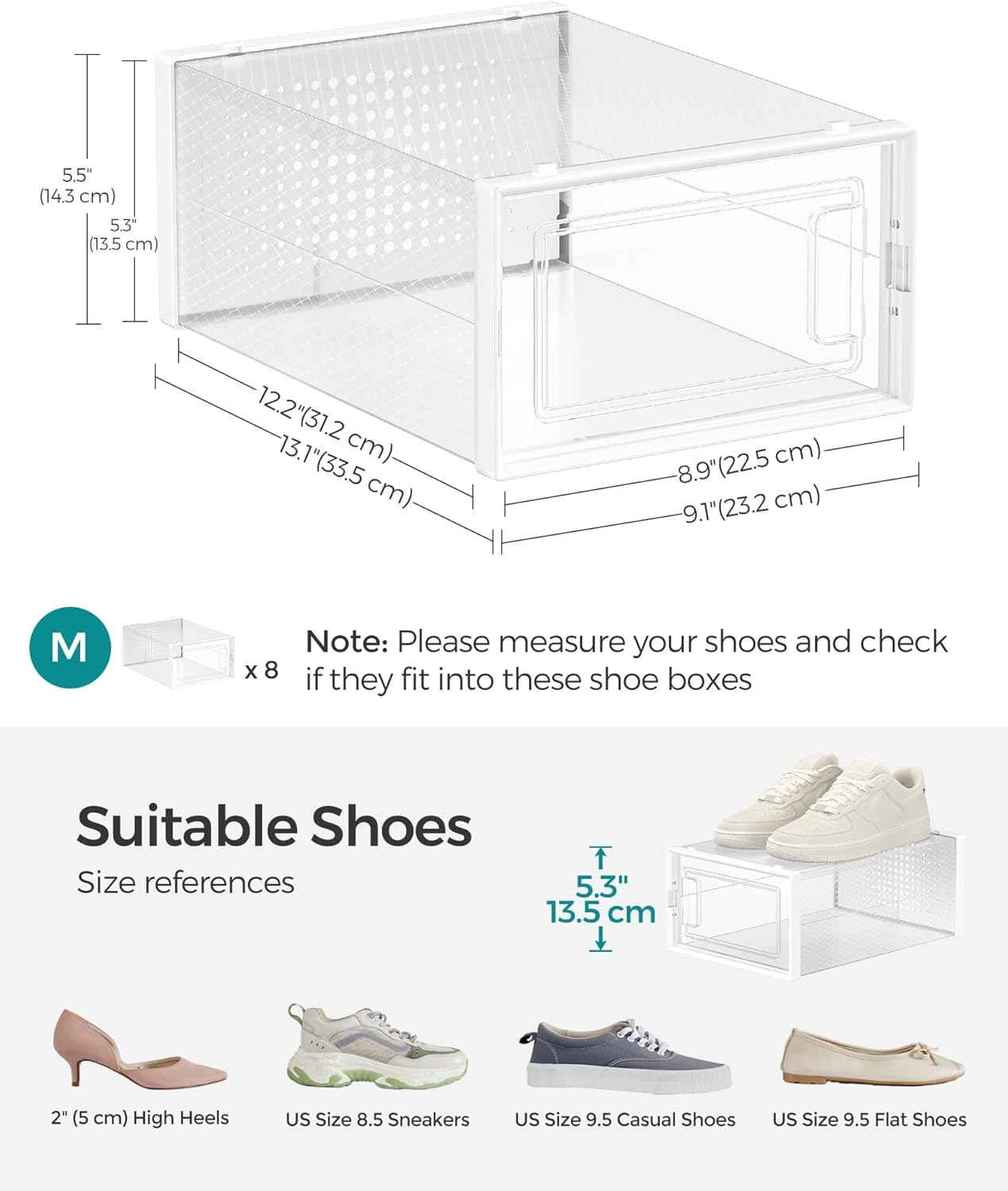 Setul SONGMICS cu 8 cutii pentru pantofi este solutia ideala pentru organizarea eficienta a incaltamintei. Designul transparent permite vizualizarea rapida a continutului, iar structura stivuibila ajuta la economisirea spatiului. Perfect pentru orice dressing sau hol ordonat.