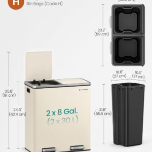 SONGMICS Cos de gunoi dublu colectare selectiva, 2x30L, cu pedale si capac soft close, galeata interioara, otel, 62x59x36 cm, crem