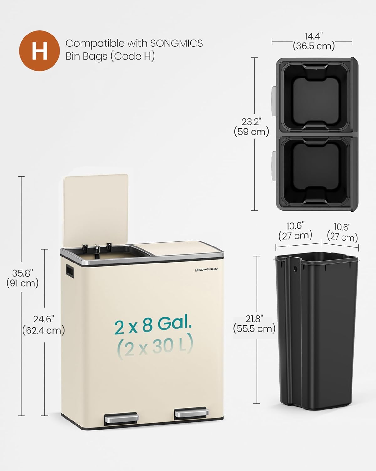 Cosul de gunoi dublu SONGMICS este alegerea ideala pentru o bucatarie moderna si bine organizata. Cu doua compartimente generoase si deschidere igienica prin pedale, permite sortarea usoara a deseurilor. Designul elegant in nuanta crem se integreaza perfect in orice decor, iar inchiderea silentioasa ofera confort in utilizare zilnica.