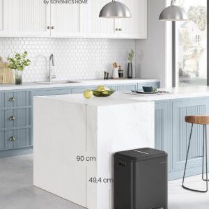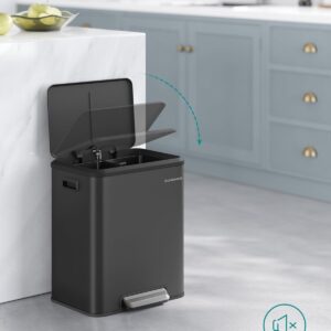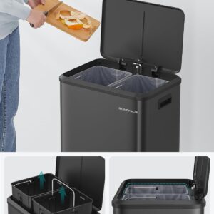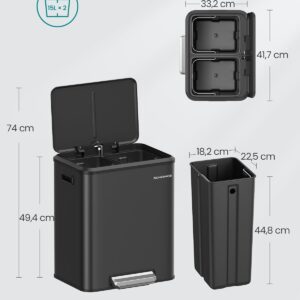 Cosul de gunoi SONGMICS cu doua compartimente este conceput pentru sortarea eficienta a deseurilor menajere si reciclabile. Sistemul cu pedala si inchidere silentioasa asigura confort in utilizare zilnica, iar galetile interioare detasabile faciliteaza curatarea si schimbarea sacilor.