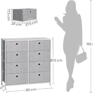 Comoda SONGMICS este solutia practica pentru organizarea eficienta a casei. Cu 8 sertare textile spatioase, cadru metalic rezistent si blat MDF, ofera un echilibru perfect intre functionalitate si design modern. Usor de integrat in living, dormitor sau hol, aceasta comoda asigura spatiu suficient pentru haine, lenjerii sau diverse accesorii, contribuind la un ambient ordonat si placut.