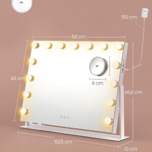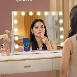 SONGMICS Oglinda machiaj cu iluminare LED, 3 culori lumina, suport telefon, porturi USB, zoom 10x, 58×43 cm, alb