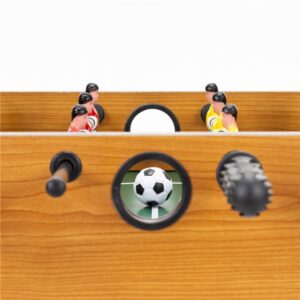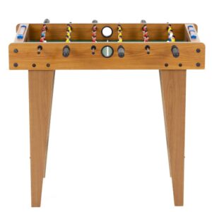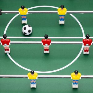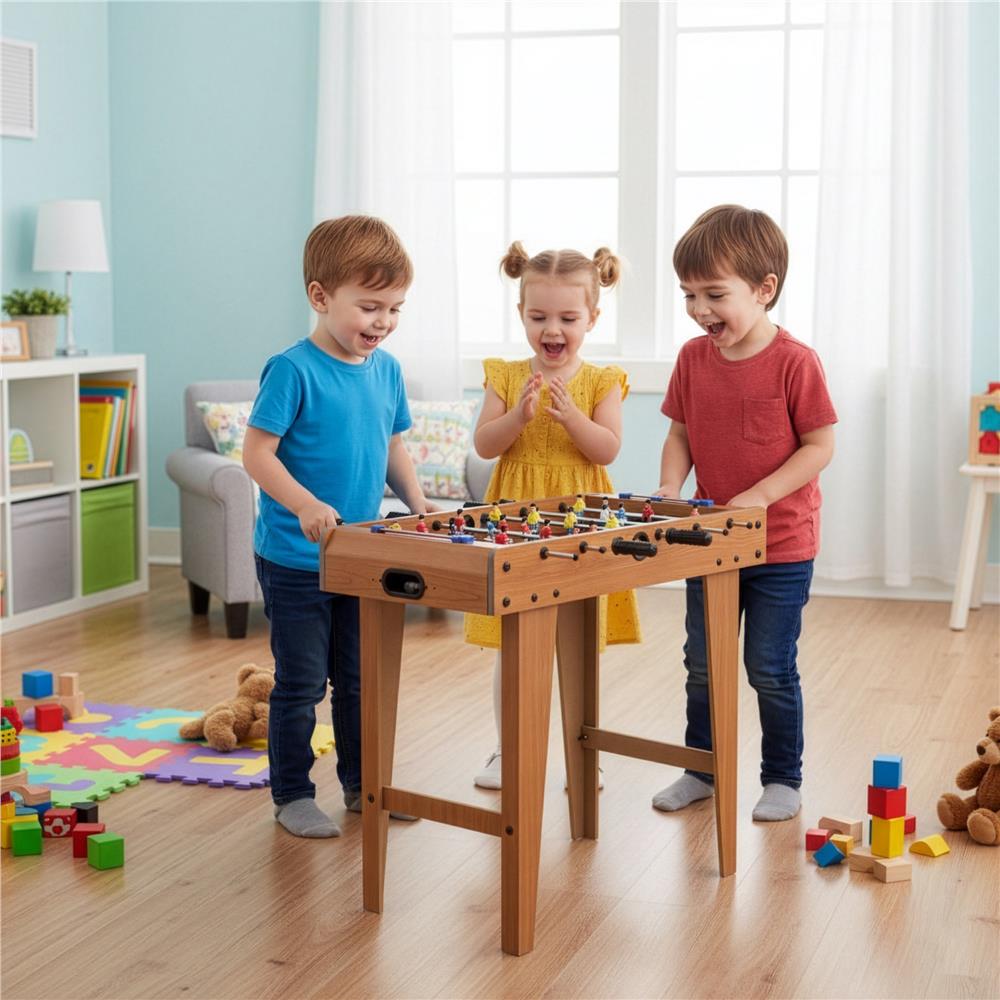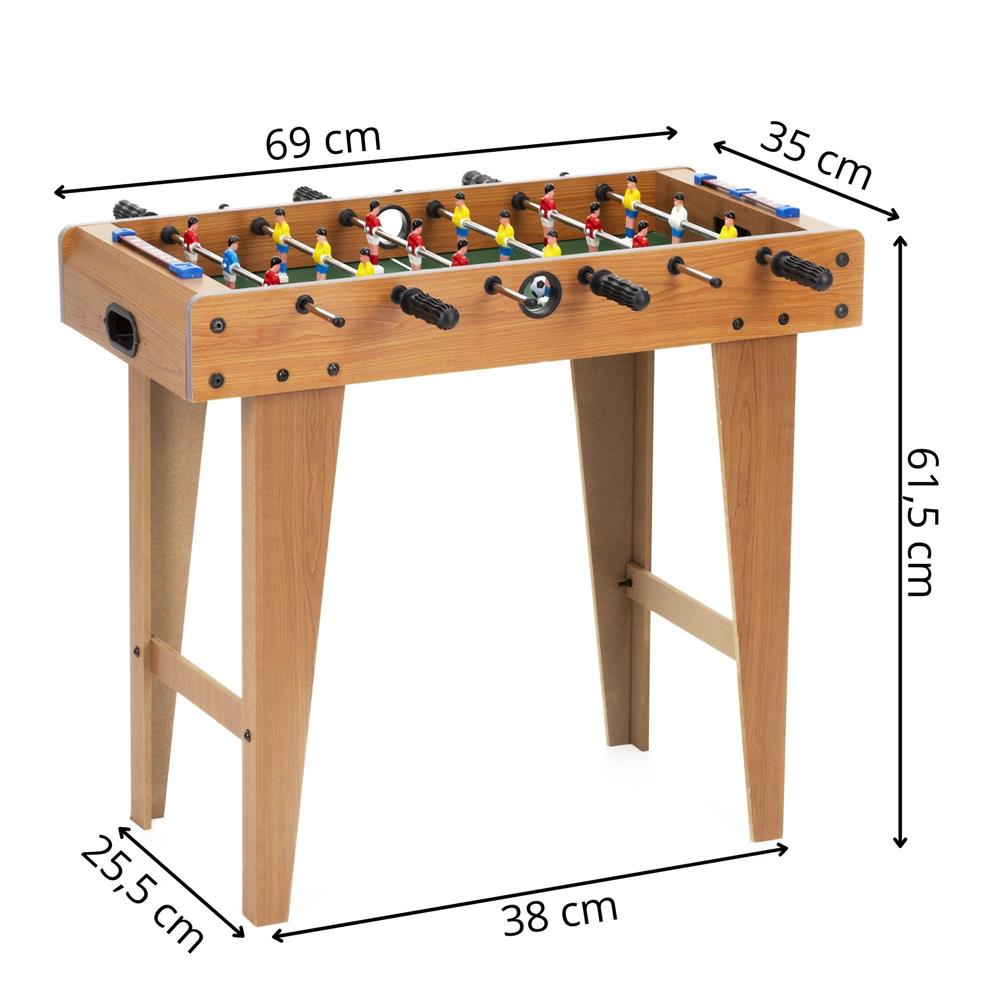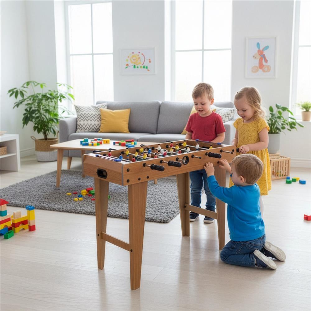 Masa de fotbal pentru copii, conceputa pentru jocuri dinamice si distractie in familie. Structura realizata din MDF, cu bare metalice si jucatori din plastic rezistent, ofera stabilitate si durabilitate. Masa este prevazuta cu sistem de punctaj pentru ambele echipe si orificii laterale pentru introducerea mingilor. Manerele antiderapante asigura control bun in timpul jocului. Produs livrat pentru asamblare individuala, cu instructiuni disponibile prin cod QR.