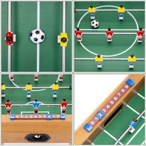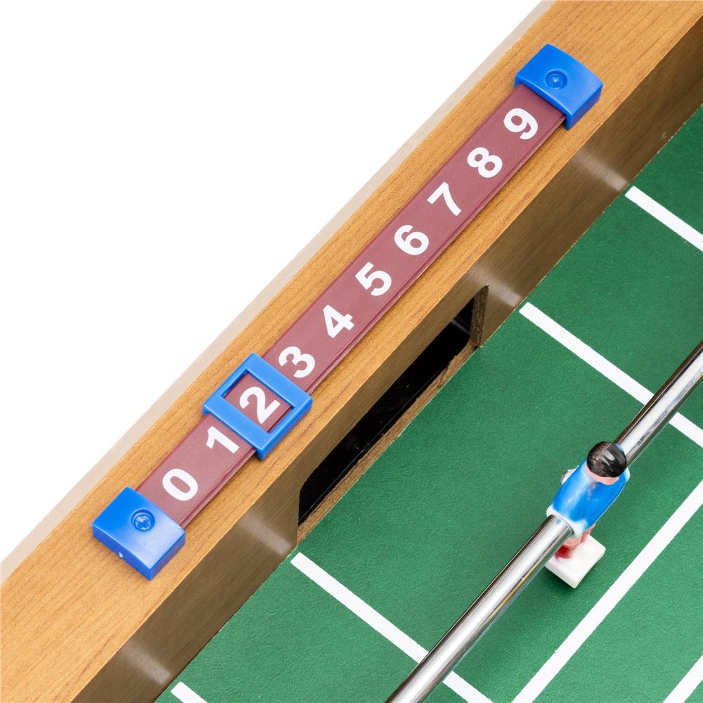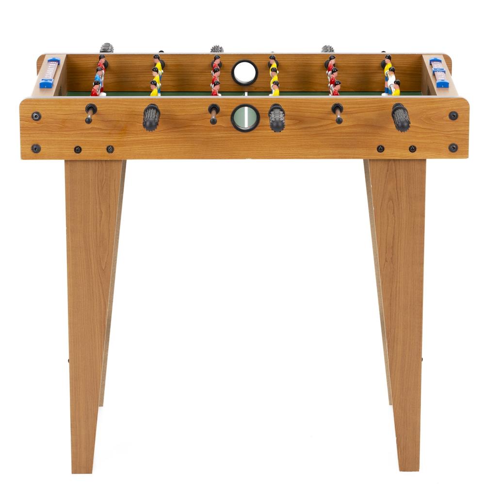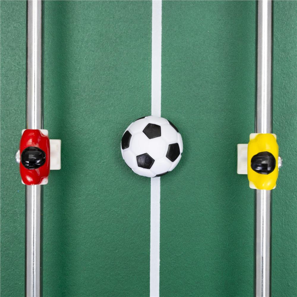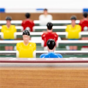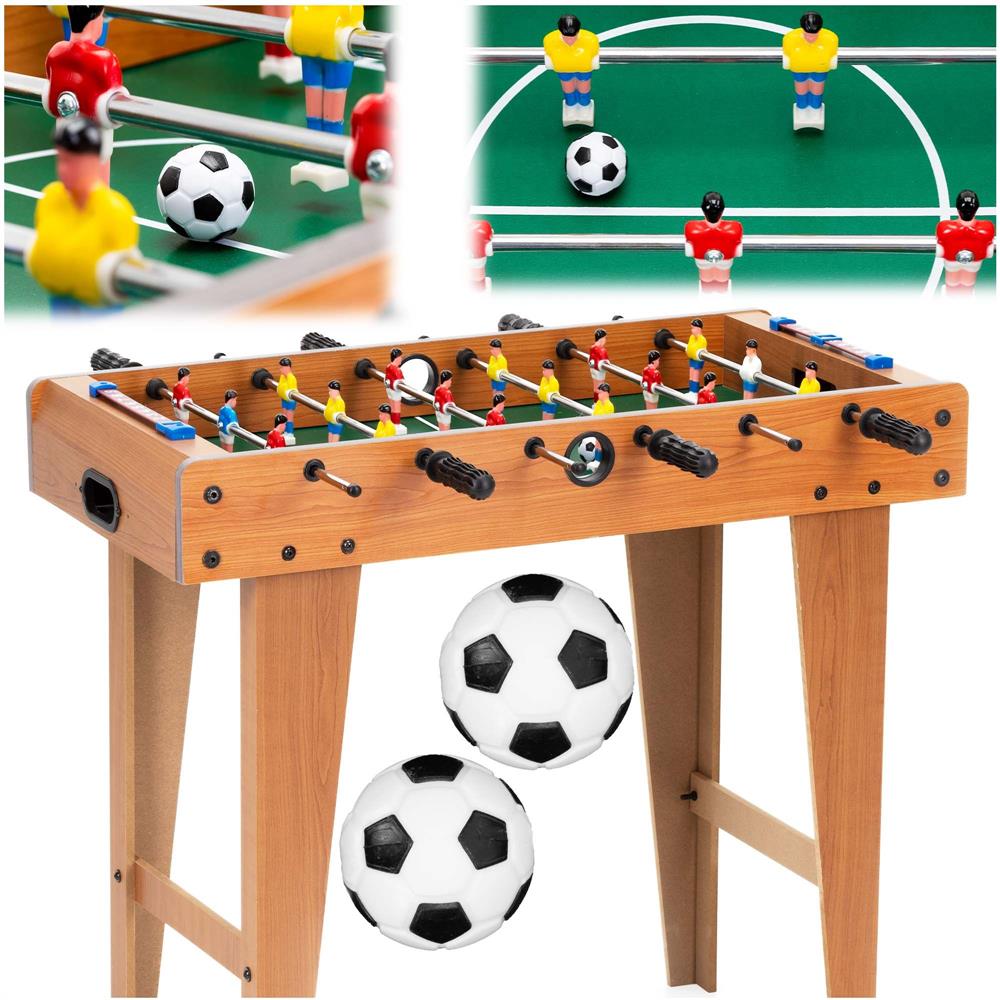 Masa de fotbal pentru copii, conceputa pentru jocuri dinamice si distractie in familie. Structura realizata din MDF, cu bare metalice si jucatori din plastic rezistent, ofera stabilitate si durabilitate. Masa este prevazuta cu sistem de punctaj pentru ambele echipe si orificii laterale pentru introducerea mingilor. Manerele antiderapante asigura control bun in timpul jocului. Produs livrat pentru asamblare individuala, cu instructiuni disponibile prin cod QR.