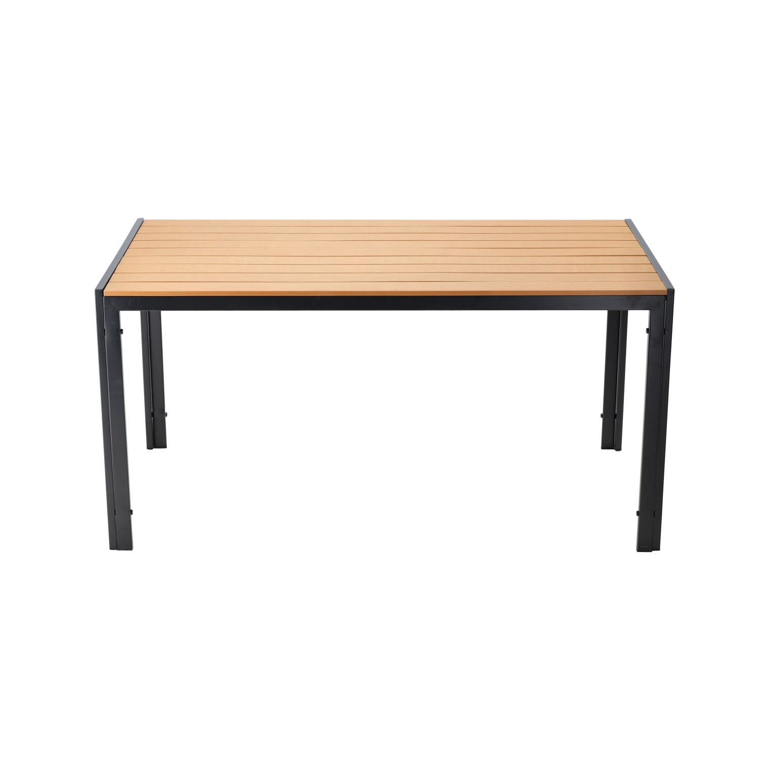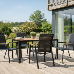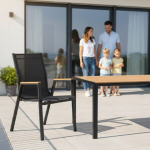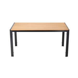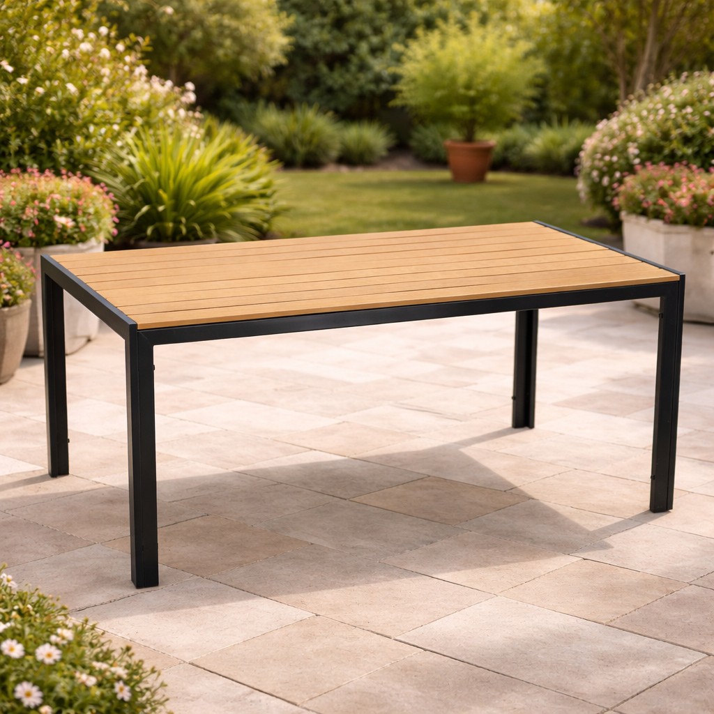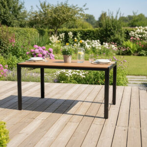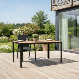 Masa de gradina imbina designul minimalist cu durabilitatea ridicata. Cadrul din otel si blatul din polywood cu aspect de lemn natural ofera rezistenta excelenta la uzura si conditii meteo. Este alegerea ideala pentru terasa sau gradina, oferind un spatiu confortabil pentru mese si momente de relaxare in aer liber.