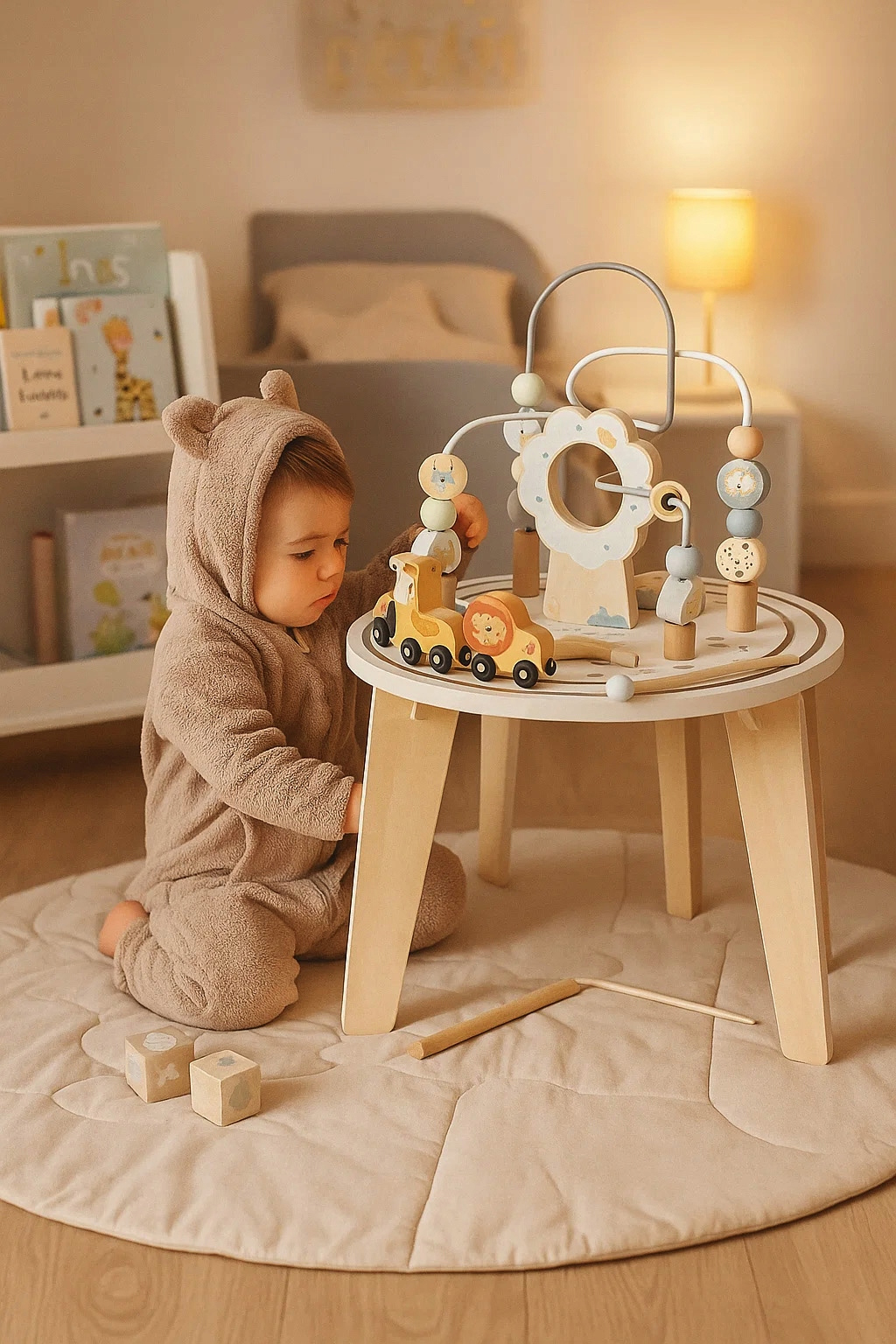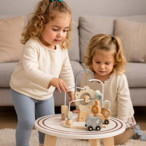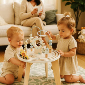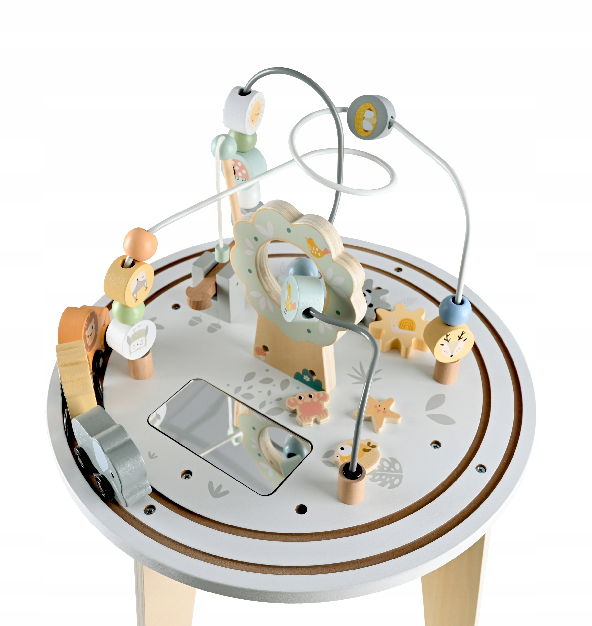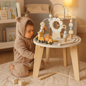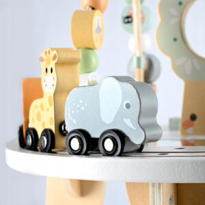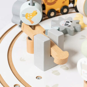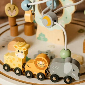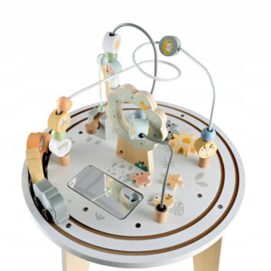 Masuta interactiva din lemn este ideala pentru dezvoltarea abilitatilor motorii si a coordonarii mana-ochi. Blatul include multiple activitati care stimuleaza curiozitatea si invatarea prin joaca. Designul stabil si culorile pastelate o transforma intr-un element atractiv pentru orice camera de copii.
