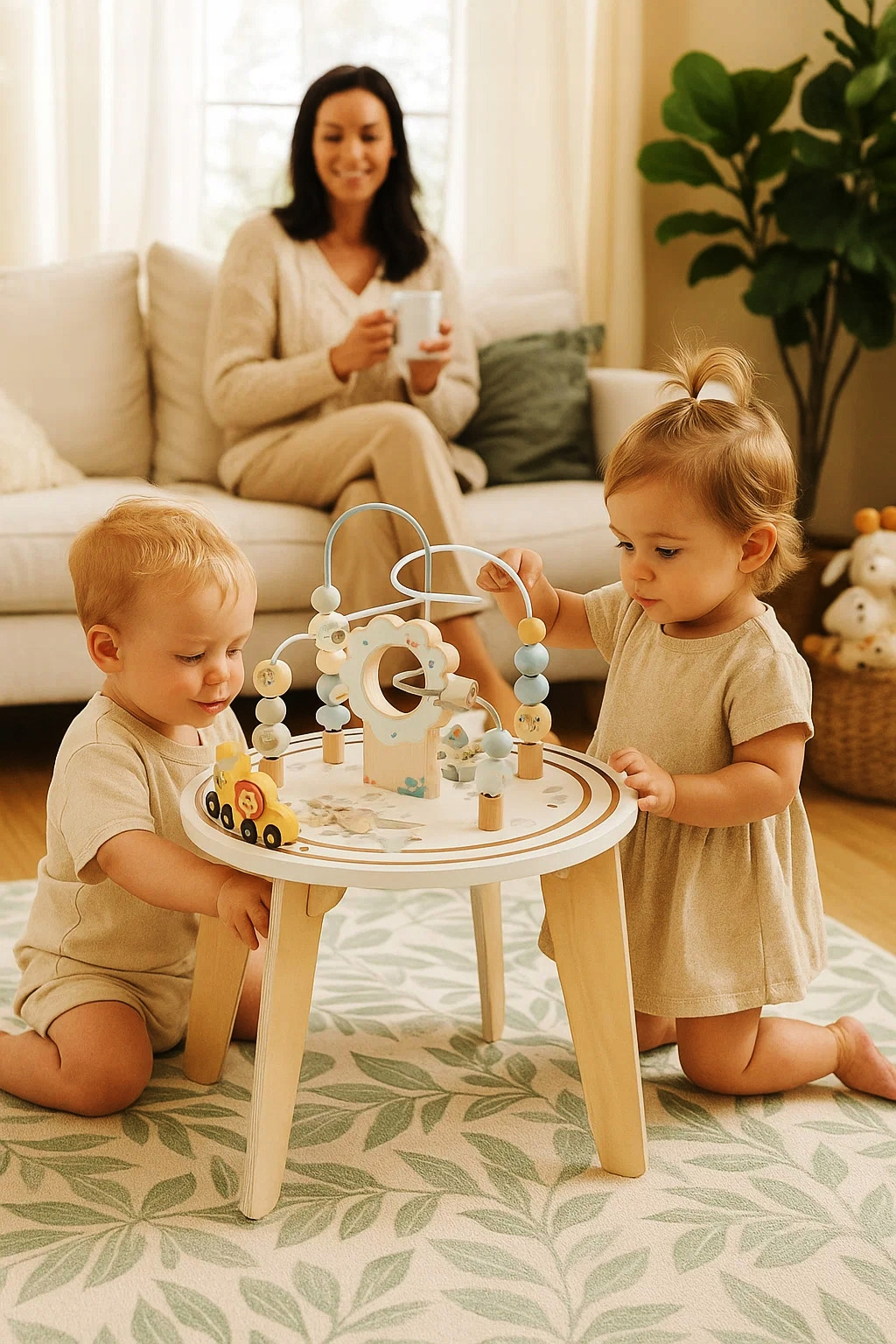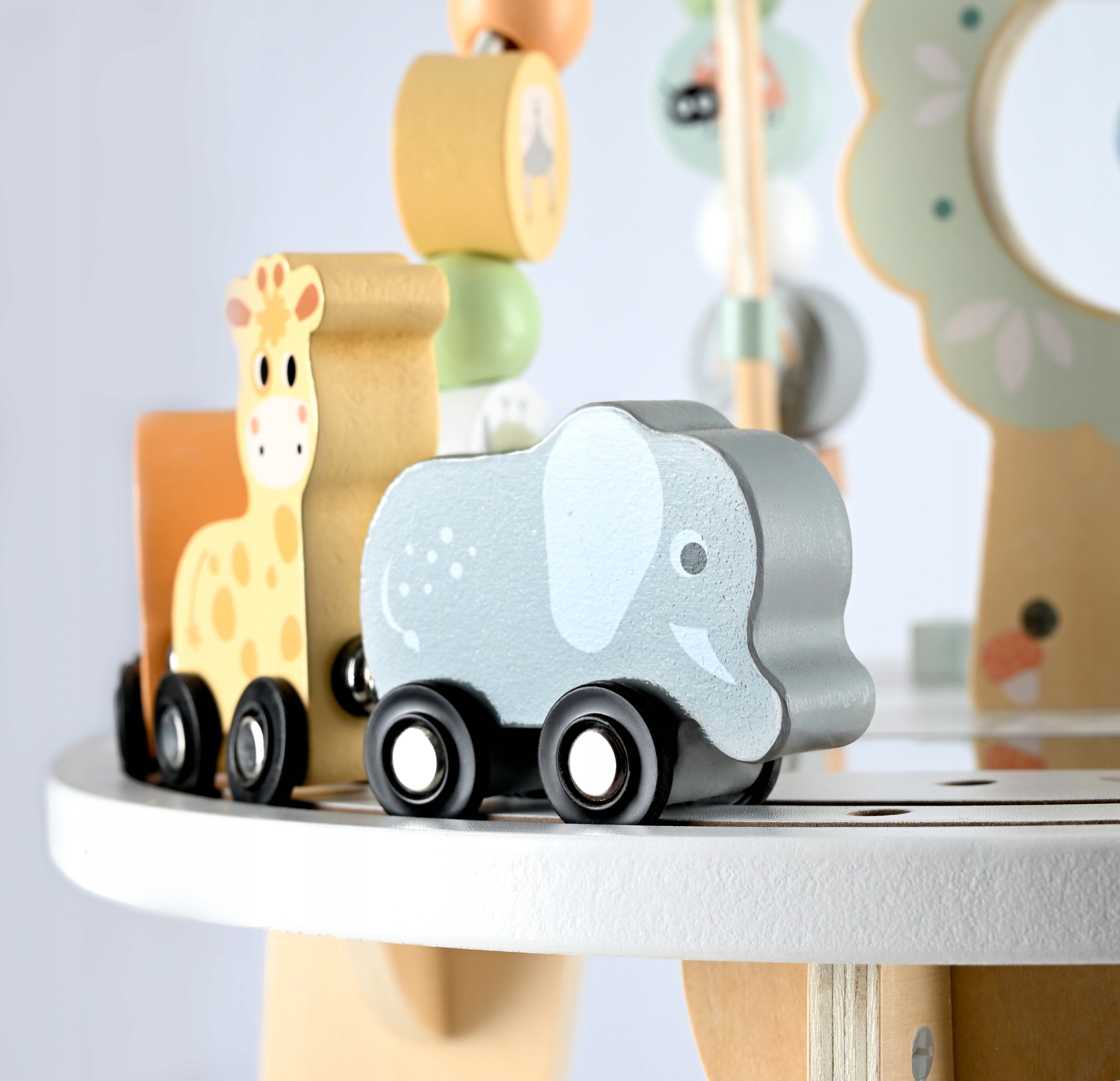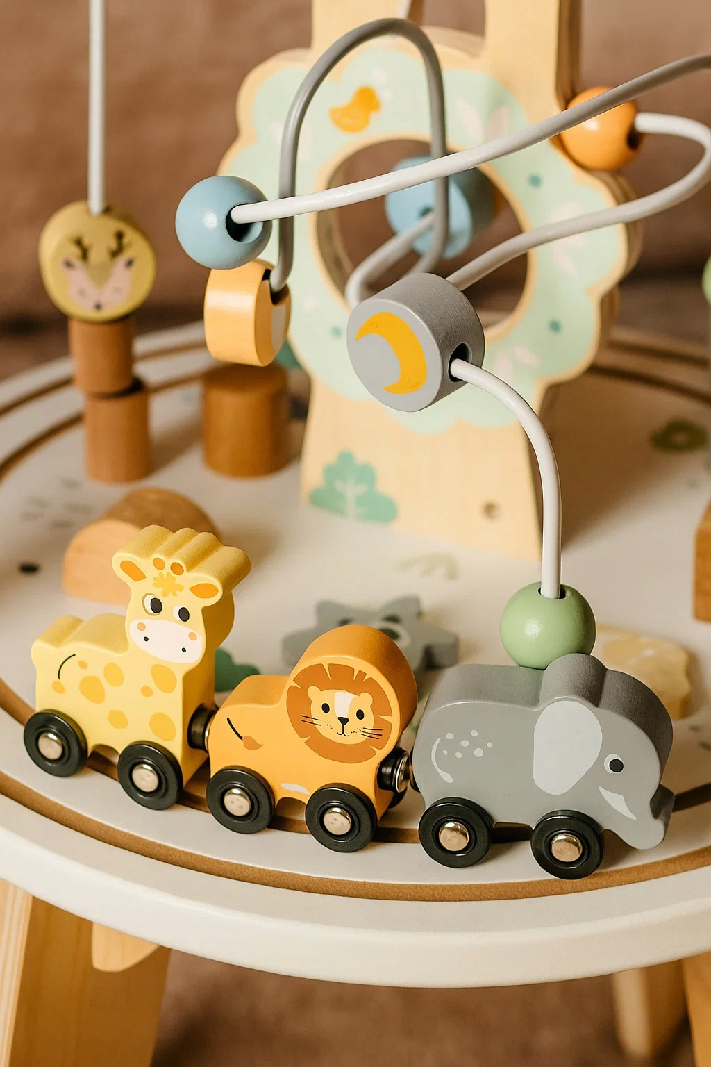 Masuta interactiva din lemn este ideala pentru dezvoltarea abilitatilor motorii si a coordonarii mana-ochi. Blatul include multiple activitati care stimuleaza curiozitatea si invatarea prin joaca. Designul stabil si culorile pastelate o transforma intr-un element atractiv pentru orice camera de copii.