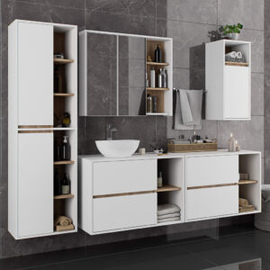 Etajera suspendata de baie VAMI W35 este solutia ideala pentru spatii mici, oferind functionalitate fara a ocupa prea mult loc. Fabricata din PAL laminat rezistent, asigura durabilitate si un aspect modern. Finisajul mat in combinatia alb/stejar sonoma aduce luminozitate si caldura baii. Include trei rafturi interne care ofera spatiu suficient pentru depozitarea cosmeticelor, prosoapelor si produselor de curatenie. Marginile sunt protejate cu okleina ABS, un material durabil care sporeste rezistenta la umezeala si impact.