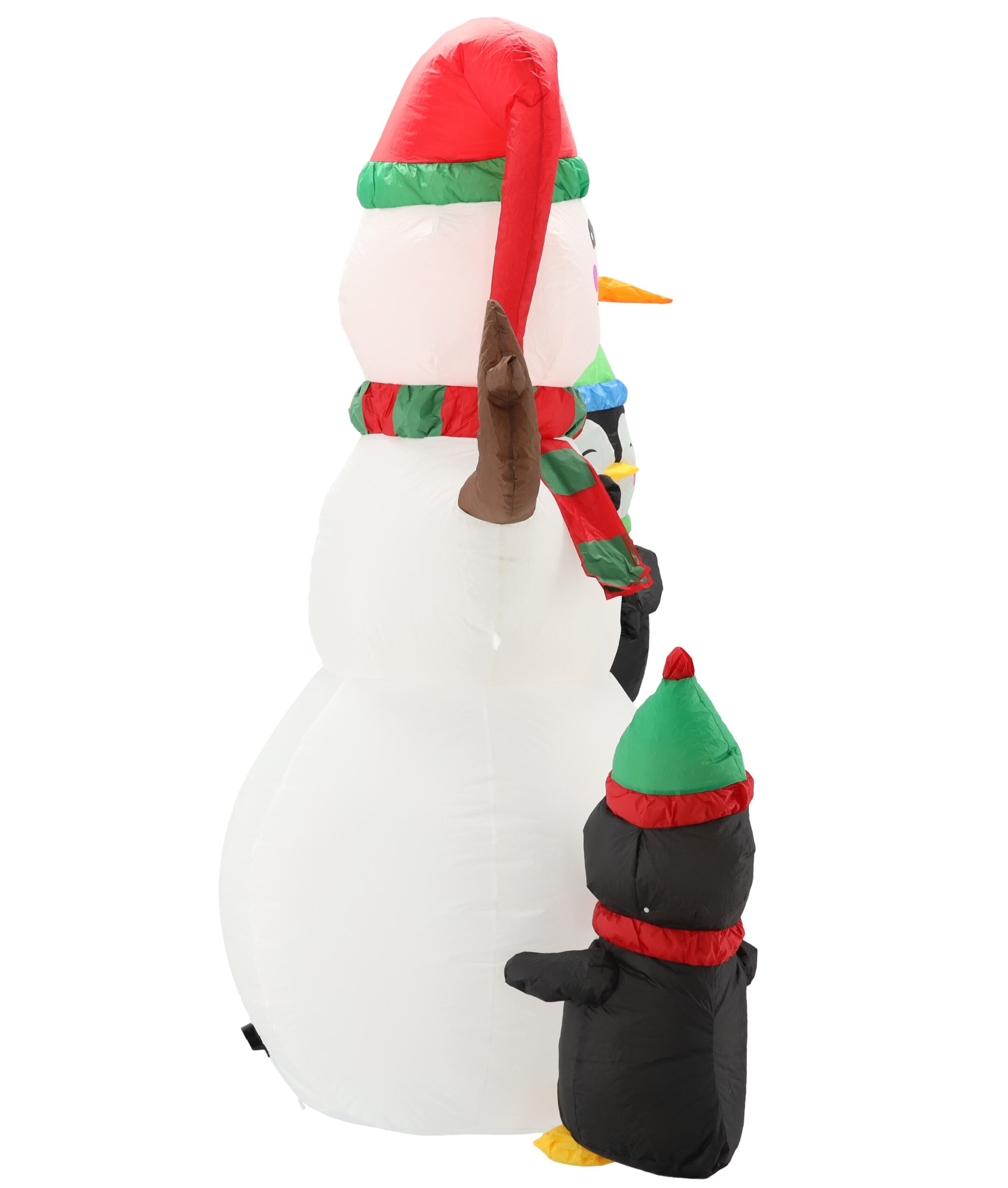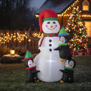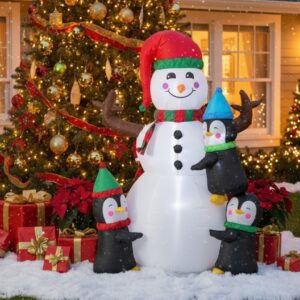 Omul de zapada gonflabil de 190 cm, acompaniat de pinguini decorativi si iluminare LED, aduce un farmec aparte decoratiunilor de iarna. Lumina puternica si designul prietenos transforma gradina, casa sau vitrina magazinului intr-un spatiu festiv si primitor.