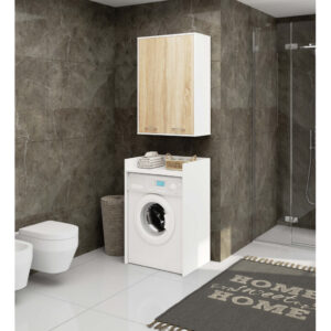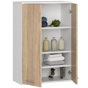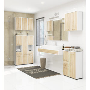Dulapul suspendat FIN alb/sonoma este o alegere eleganta si practica pentru bai moderne sau clasice. Cu doua usi si patru rafturi interioare, ofera un spatiu amplu pentru organizarea produselor de ingrijire si a accesoriilor de baie. Confectionat din PAL laminat de inalta calitate Kronospan si protejat cu margini ABS, acest dulap combina durabilitatea cu un design modern si versatil.