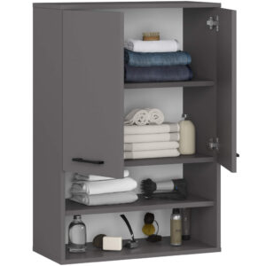 Dulap baie suspendat, cu 2 usi si 2 rafturi deschise, PAL 16 mm, 64x30x94 cm, gri
