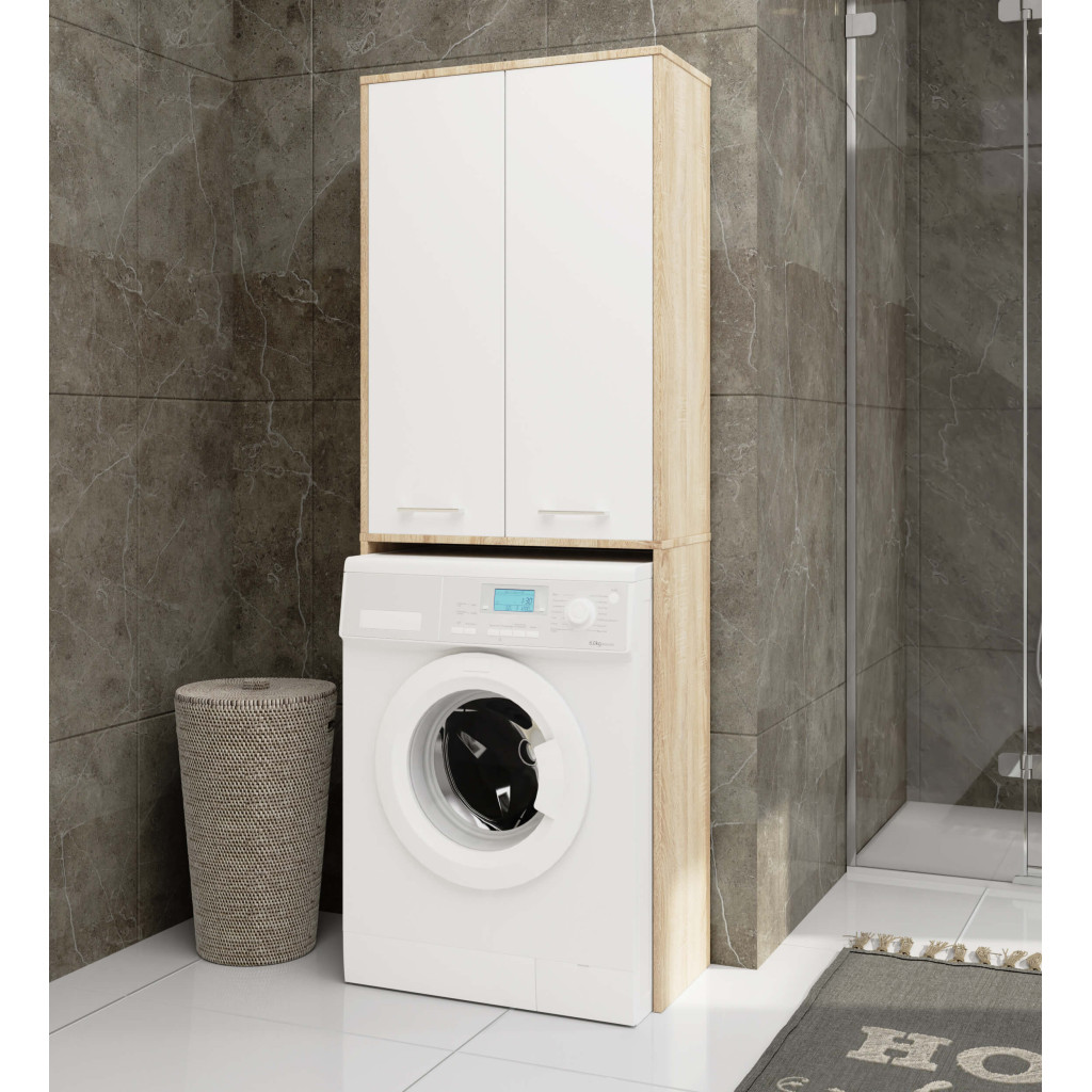 Dulapul de baie FIN este o solutie moderna si practica pentru utilizarea eficienta a spatiului de deasupra masinii de spalat. Realizat din PAL laminat de inalta calitate, imbina durabilitatea cu un design estetic in finisaj stejar sonoma si fronturi albe. Cele patru rafturi si cele doua usi ofera spatiu generos pentru depozitarea detergentilor, prosoapelor si altor produse de ingrijire, pastrand baia ordonata si eleganta.