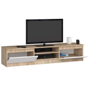 Comoda RTV de 160 cm in finisaj sonoma cu fronturi albe, ideala pentru televizoare mari de 55–65 inch si chiar mai mari. Ofera polite pentru echipamente media si doua compartimente inchise pentru depozitare. Designul modern si contrastul placut completeaza perfect livingul, camera tineretului sau un birou. Constructia din PAL laminat si marginile ABS asigura durabilitate indelungata.