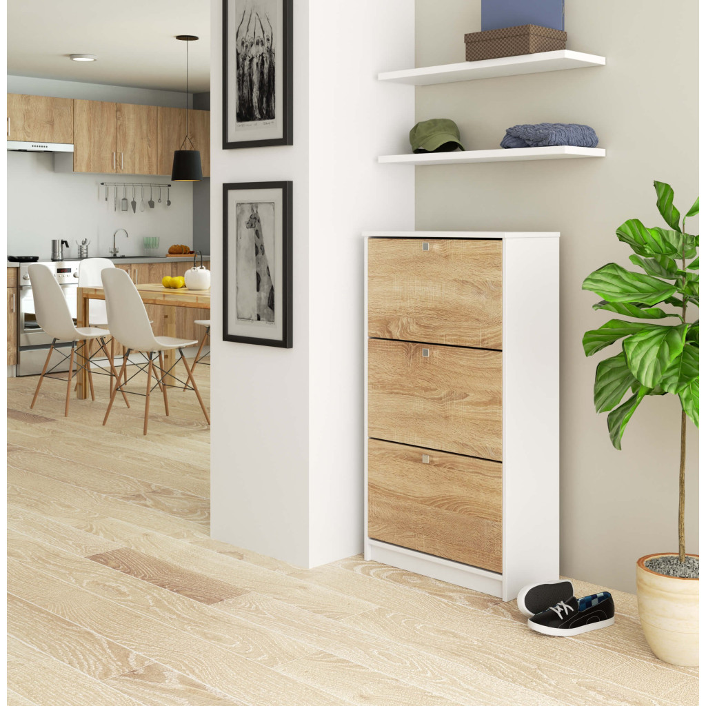 Pantofarul cu trei usi rabatabile, in combinatie alb cu sonoma, ofera o solutie spatioasa pentru organizarea incaltamintei. Cele trei cosuri duble permit depozitarea unui numar mare de perechi, iar structura din pal laminat rezistent si canturile ABS asigura durabilitate. Designul modern si formatul ingust il fac potrivit pentru holuri de orice dimensiune.