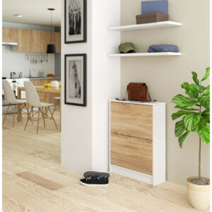 Dulapul pentru pantofi cu doua usi rabatabile este o solutie compacta si practica pentru holuri mici sau spatii inguste. Structura din pal laminat rezistent si canturile ABS asigura durabilitate, iar interiorul este prevazut cu un cos unic pentru organizarea incaltamintei. Combinatia de alb cu sonoma se potriveste in decoruri moderne si clasice, oferind un aspect curat si ordonat.