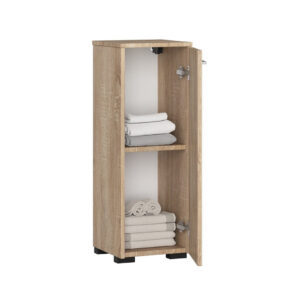 Acest dulap de baie FIN este o solutie practica si eleganta pentru depozitarea articolelor de baie. Cu un design simplu si finisaj natural stejar sonoma, se potriveste perfect atat in interioare moderne, cat si in bai clasice. Constructia din PAL laminat rezistent la uzura ofera durabilitate, iar usa reversibila permite montajul adaptat spatiului disponibil.