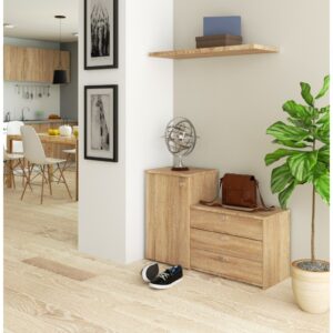 Dulap multifunctional pentru pantofi, prevazut cu 3 compartimente rabatabile si o comoda laterala cu usa si polita interioara, ideal pentru hol, antreu sau garderoba. Constructie solida din PAL laminat cu margini ABS si finisaj stejar sonoma.