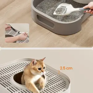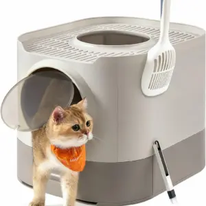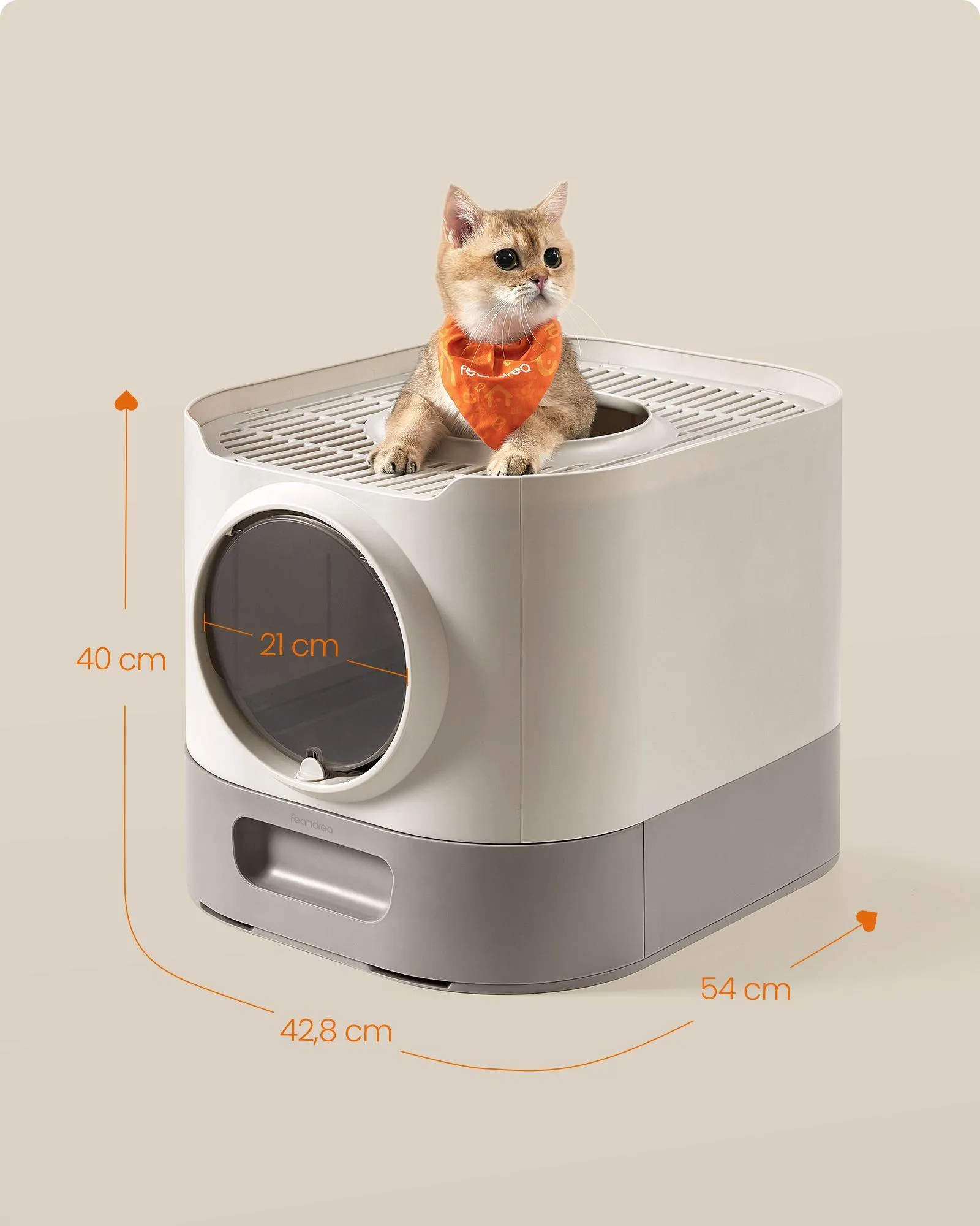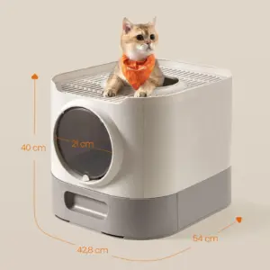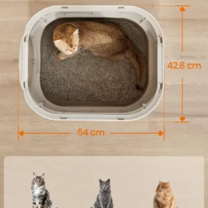 Litiera FEANDREA XXL cu capac ofera un spatiu generos si igienic pentru pisici de diferite dimensiuni. Designul inchis reduce mirosurile si asigura intimitate, iar tava extensibila permite golirea si curatarea usoara. Grilajul superior si constructia dubla laterala ajuta la mentinerea curateniei in jurul litierei.