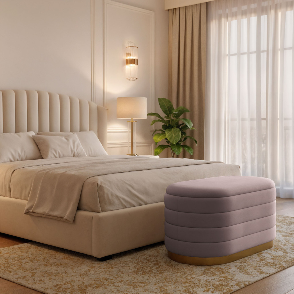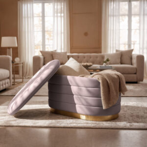 Bancheta tip puf cu spatiu de depozitare, ideala pentru living, dormitor sau hol. Tapiteria din velur moale la atingere ofera un aspect elegant si rafinat, iar compartimentul interior permite depozitarea discreta a obiectelor necesare. Designul modern glamour completeaza armonios orice amenajare sofisticata.