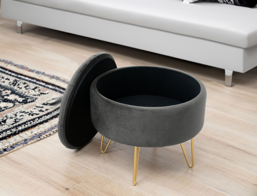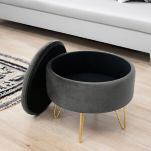Pufa CARO in nuanta grafit este un accesoriu elegant si practic pentru living sau dormitor. Tapiteria din velur ofera confort si o textura placuta la atingere, iar picioarele metalice aurii adauga un accent modern, in tendinte. Capacul rabatabil ascunde un compartiment util pentru depozitarea obiectelor folosite ocazional.