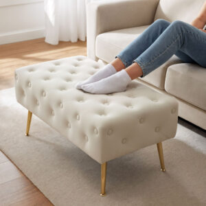 Taburet Madrid, tapitat cu catifea, tip banca, cu picioare metalice, 80x42x41 cm, bej Taburet Madrid, tapitat cu catifea, tip banca, cu picioare metalice, 80x42x41 cm, bej